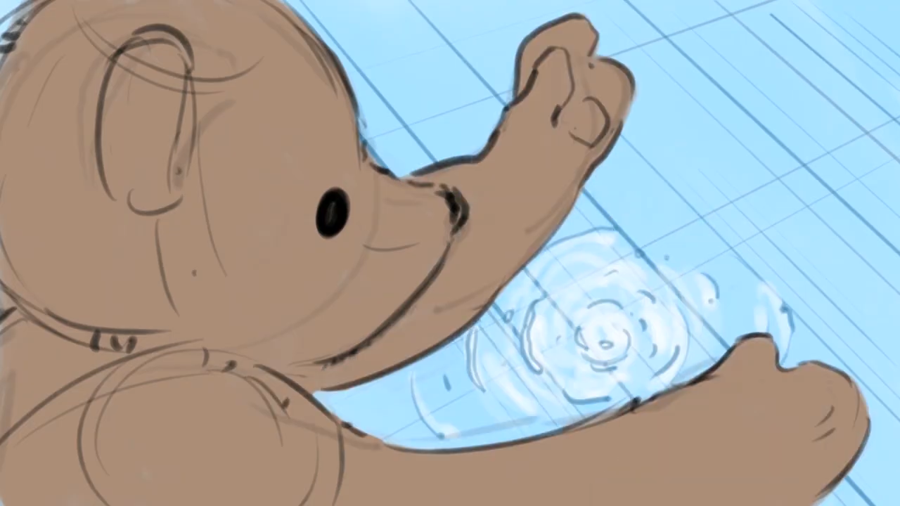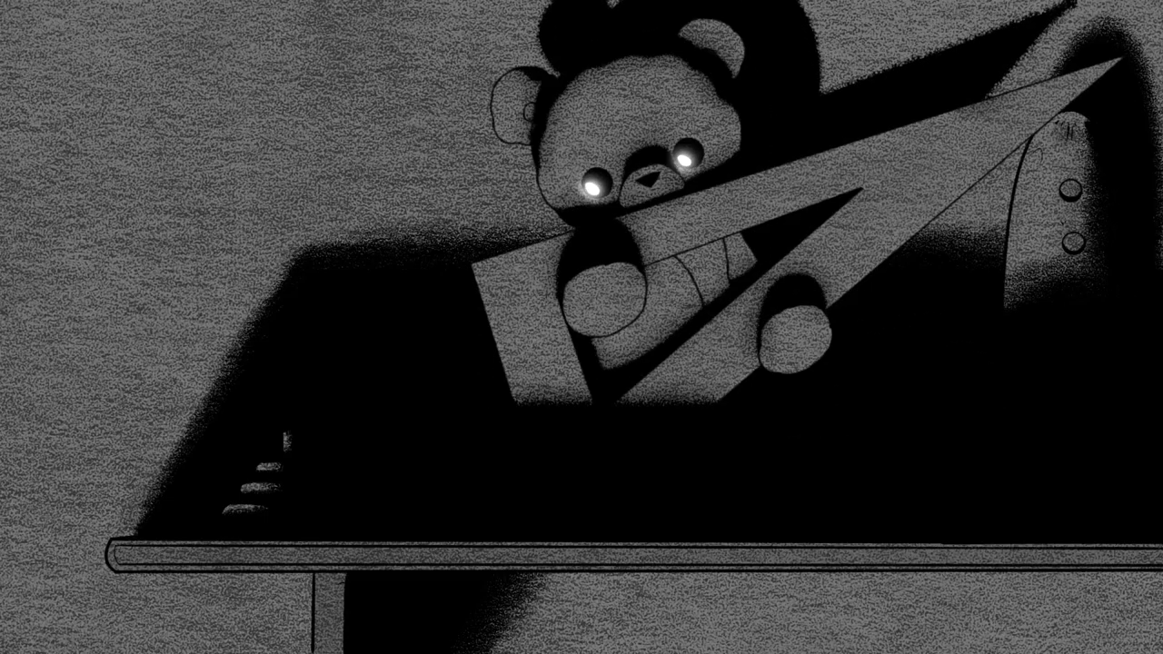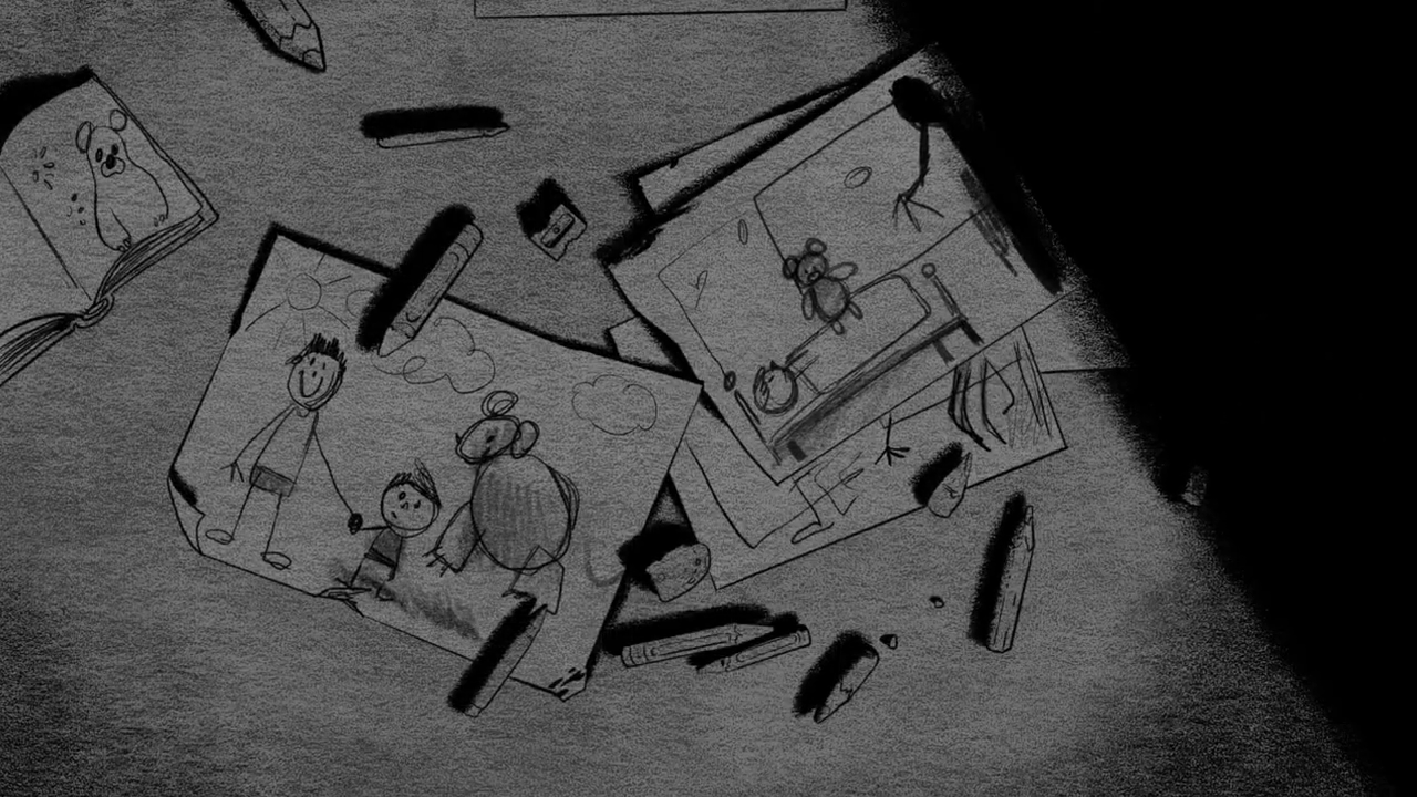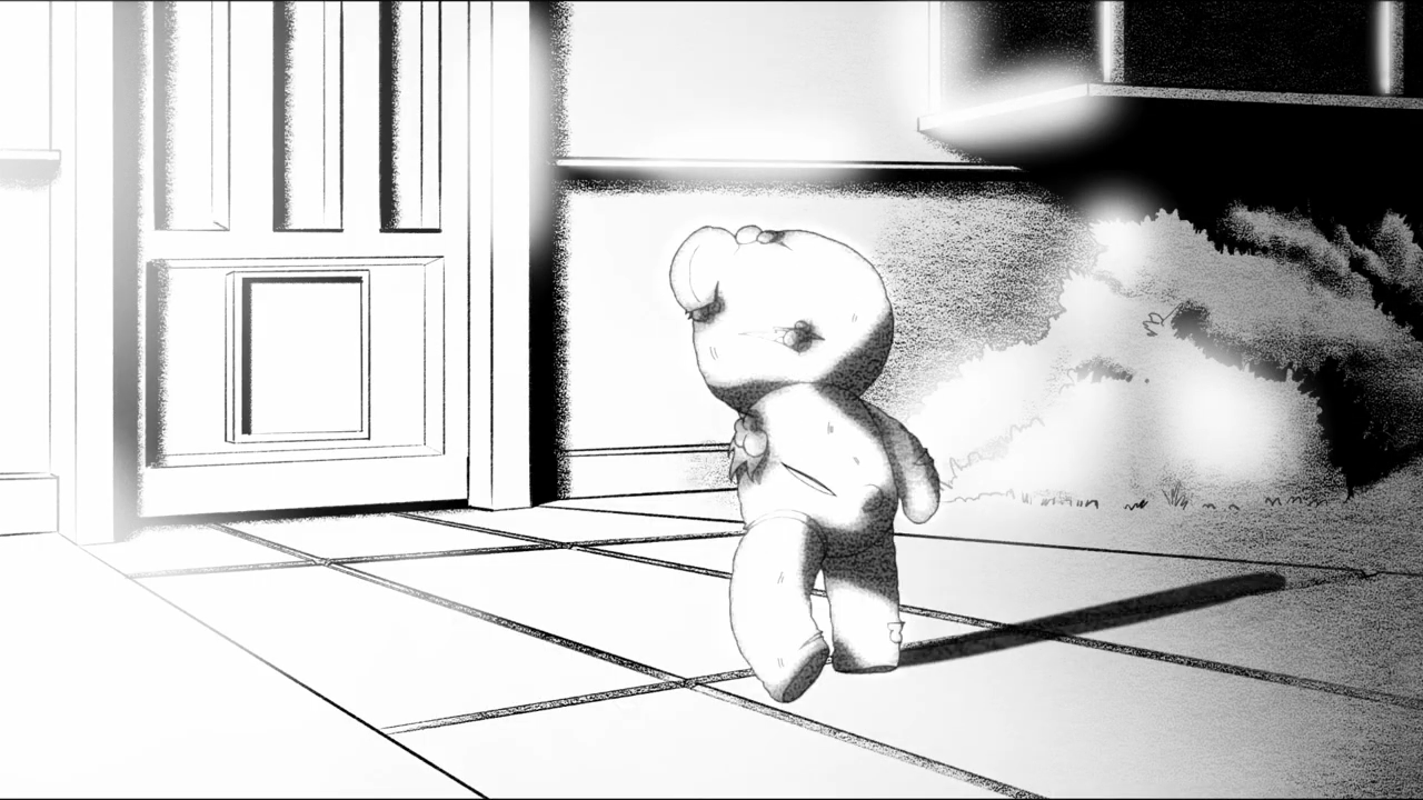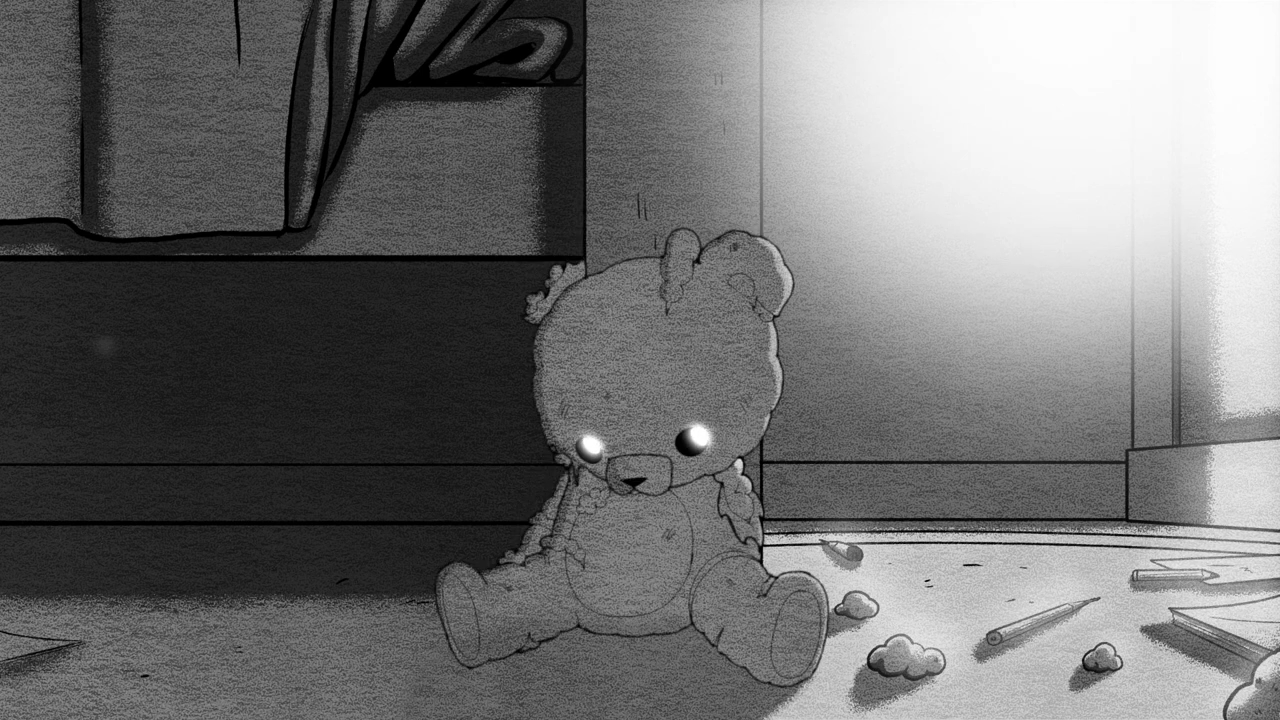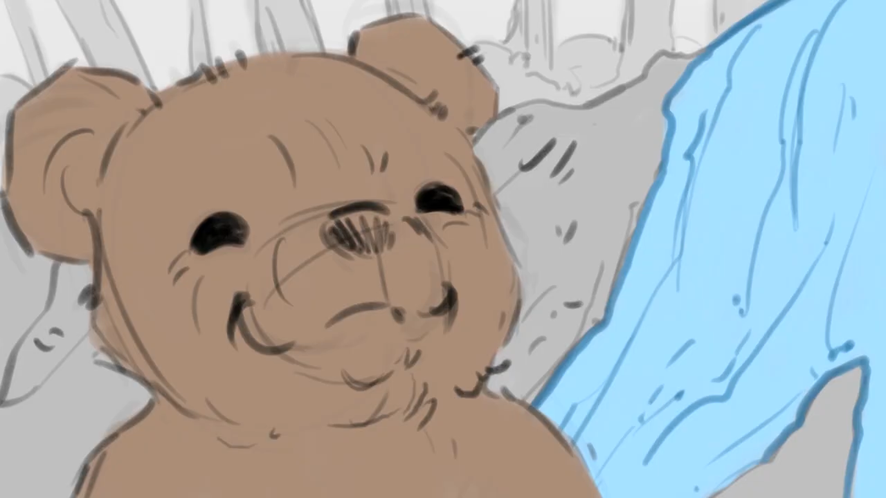 Ici, nous suivons un ourson en peluche qui chaque nuit protège son enfant d’un monstre qui hante la chambre.
