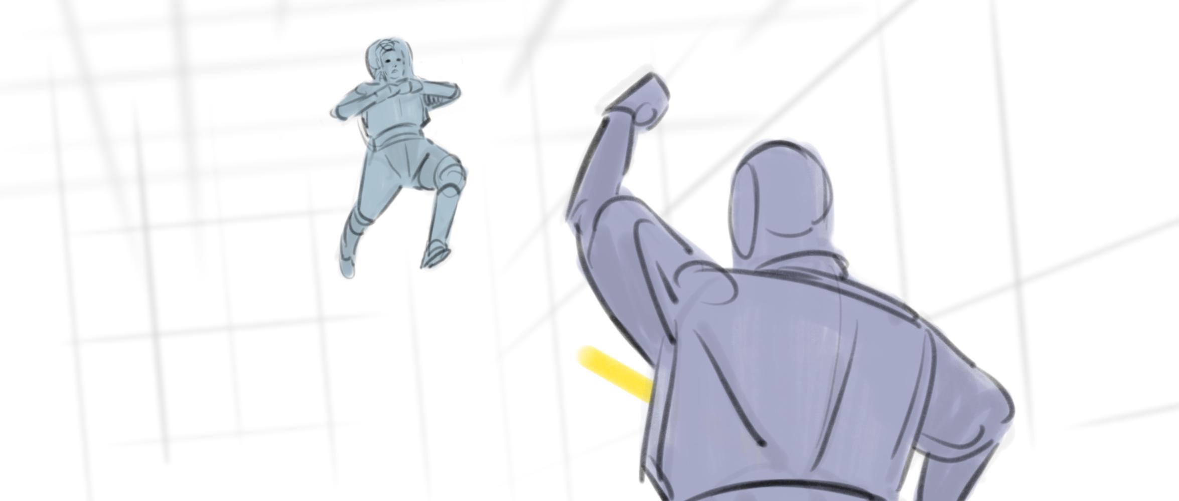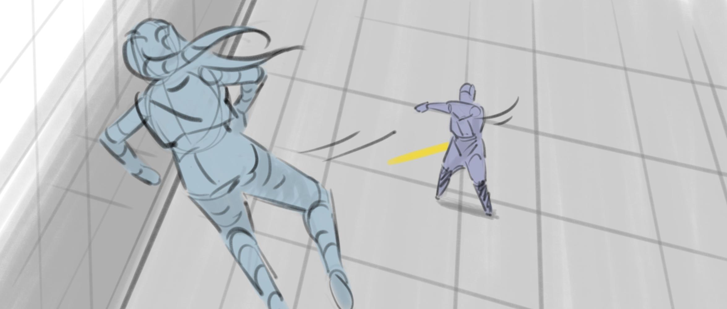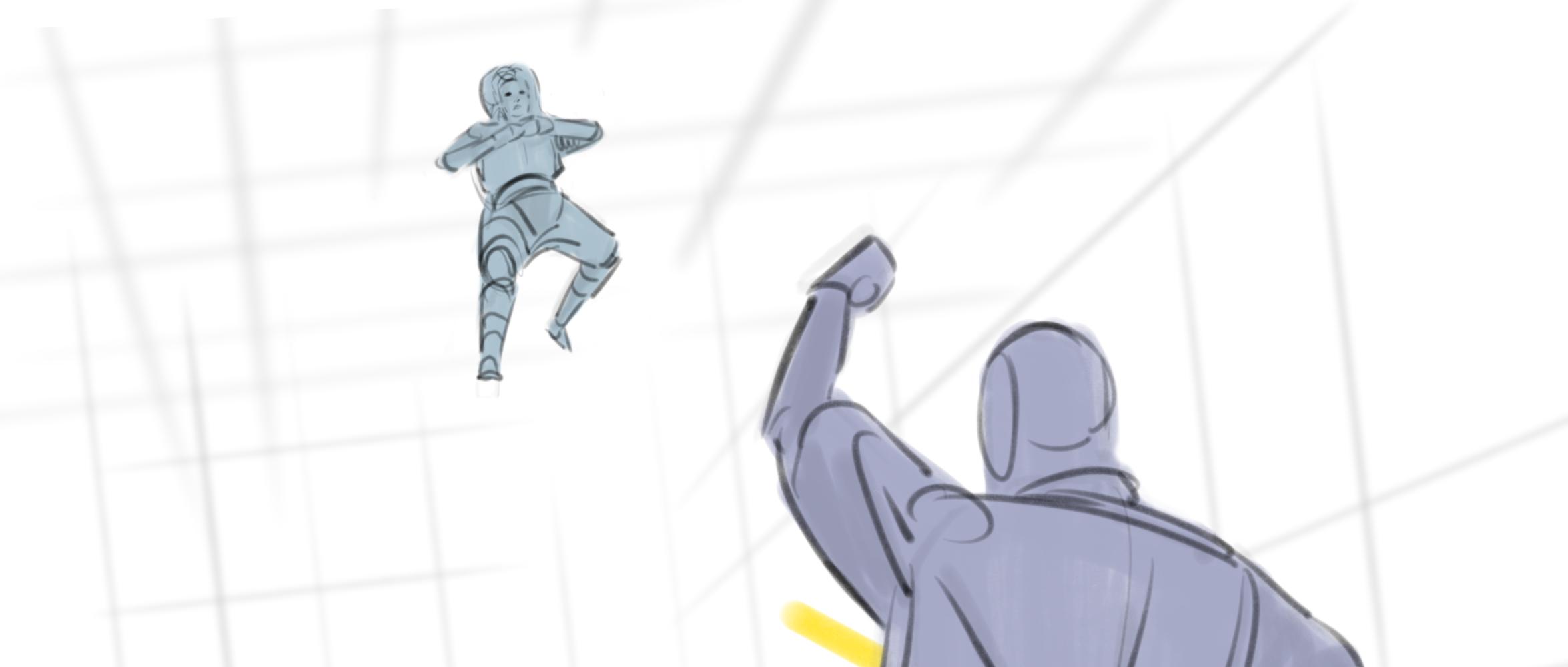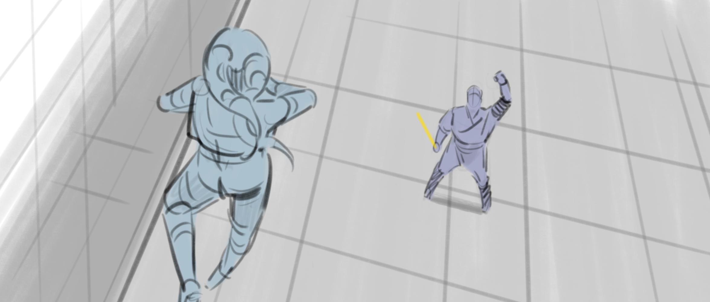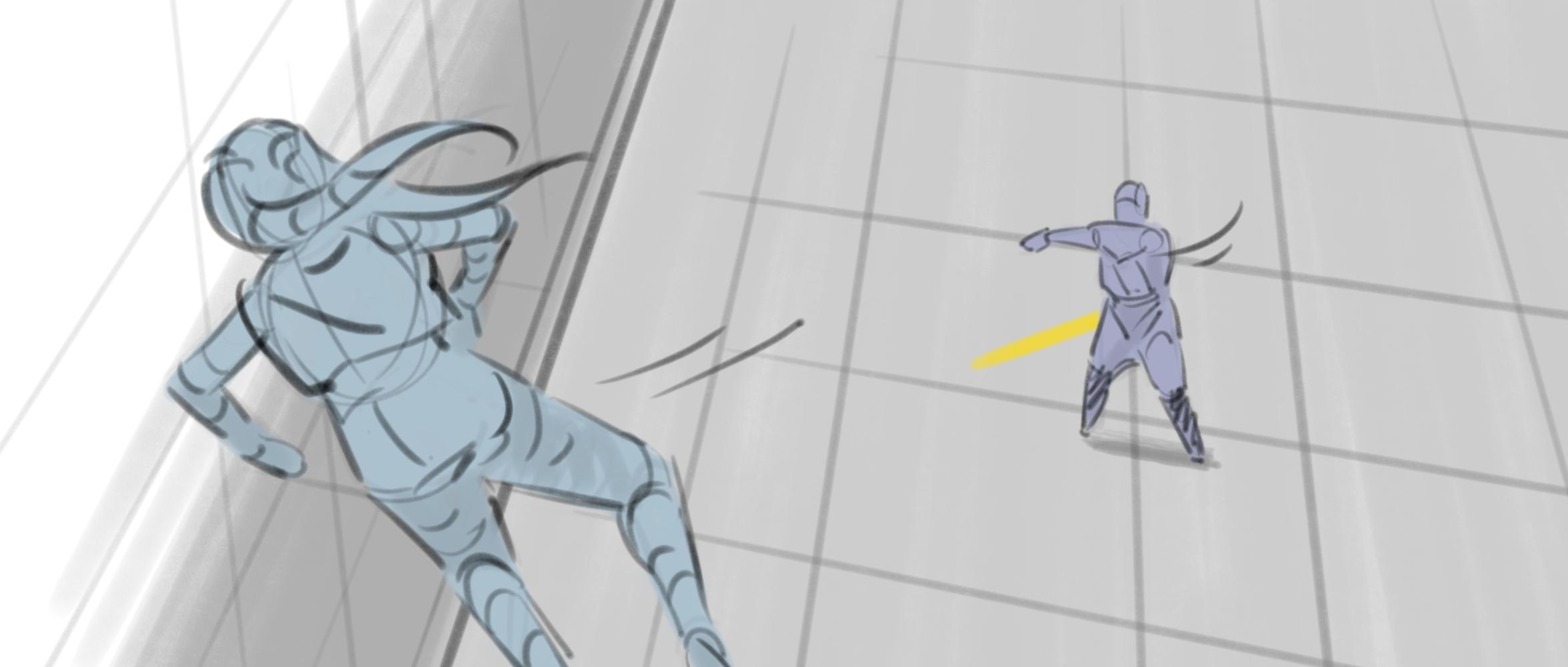 Ici, l’enjeu est avant tout de rendre l’action lisible et dynamique, notamment par un travail spécifique sur la spatialisation et la synthèse de poses clés.