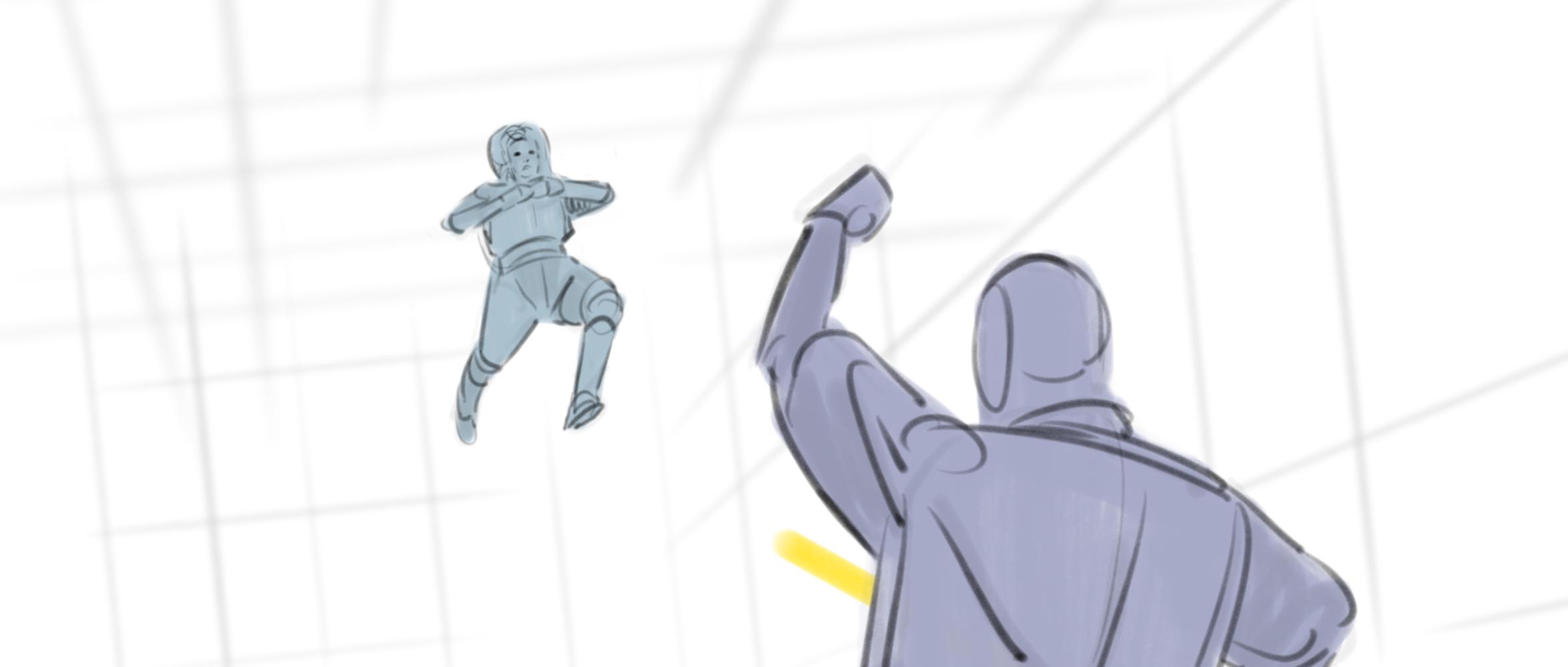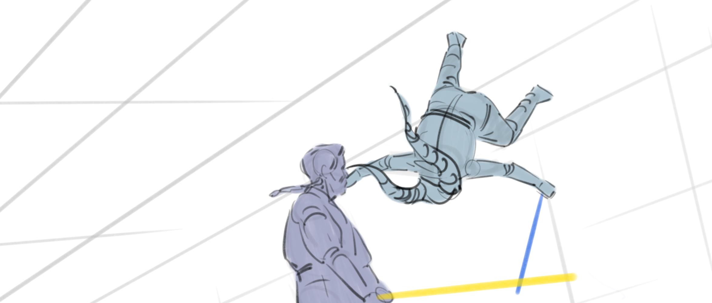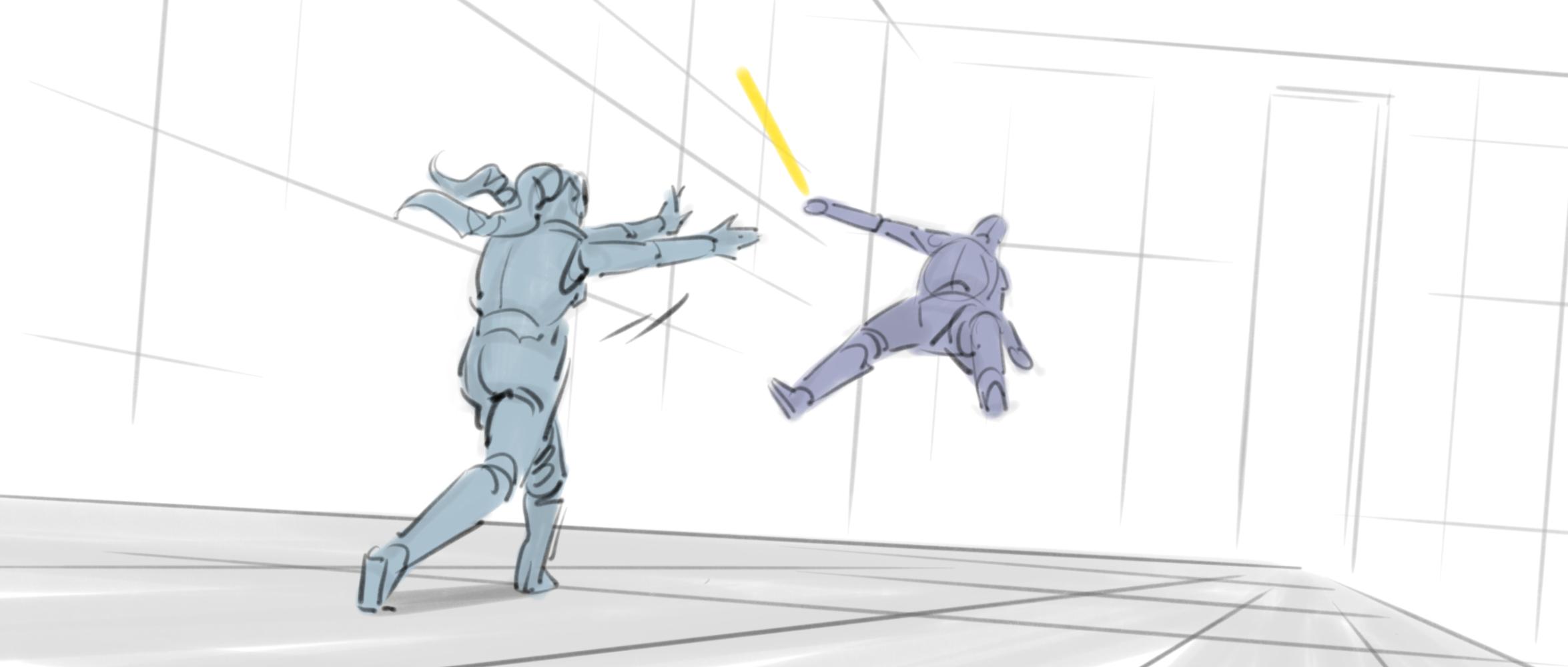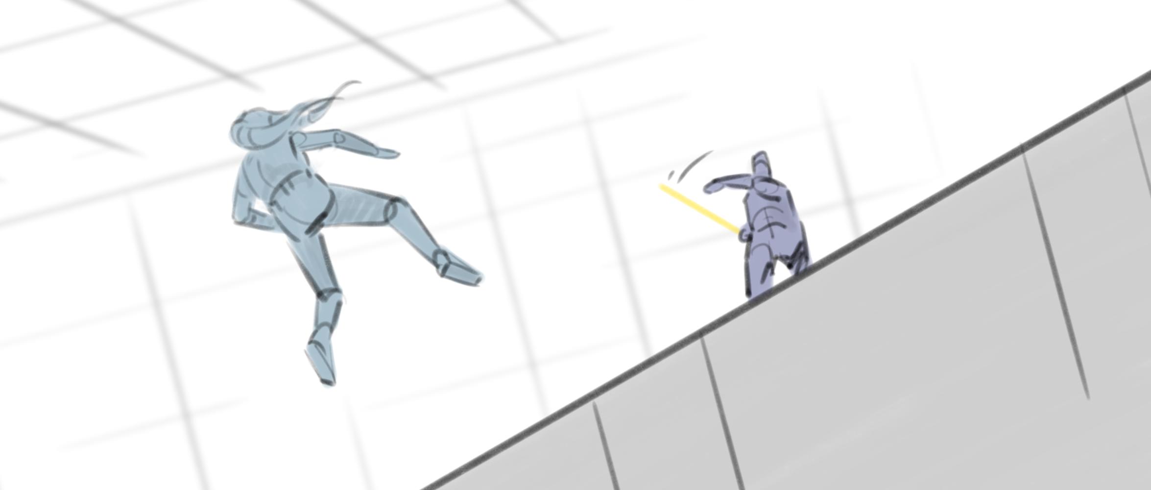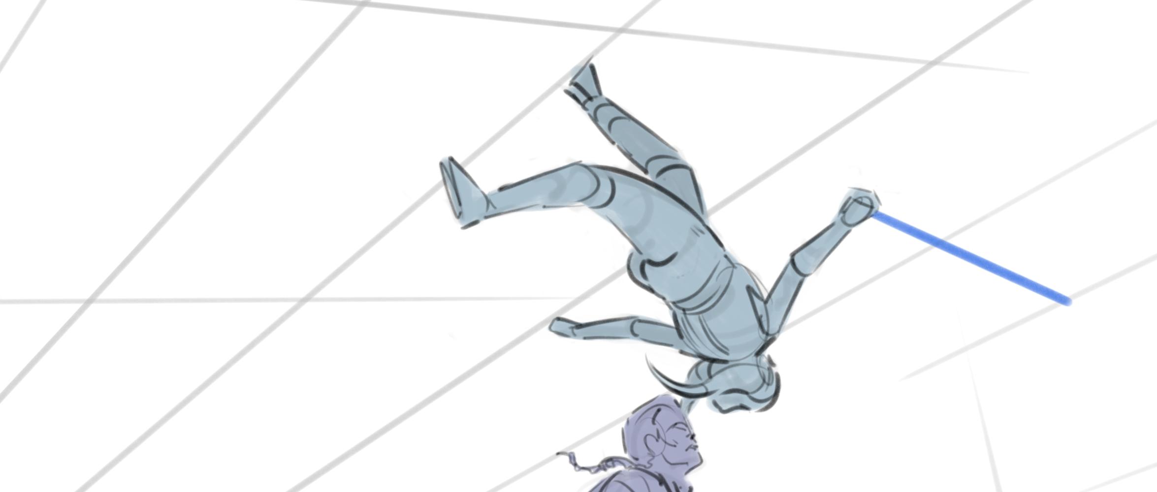 Ici, l’enjeu est avant tout de rendre l’action lisible et dynamique, notamment par un travail spécifique sur la spatialisation et la synthèse de poses clés.