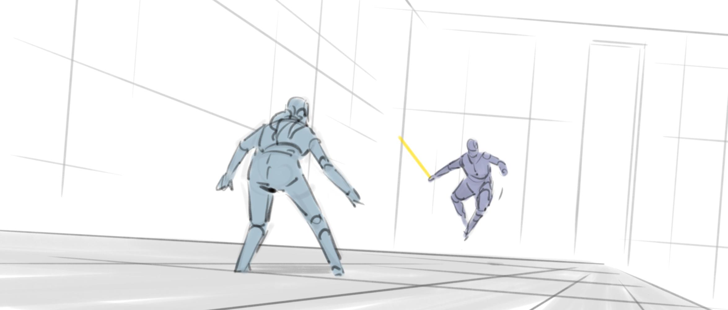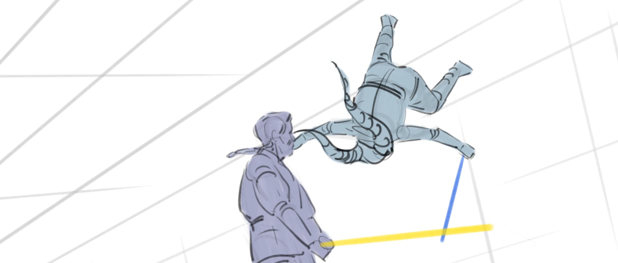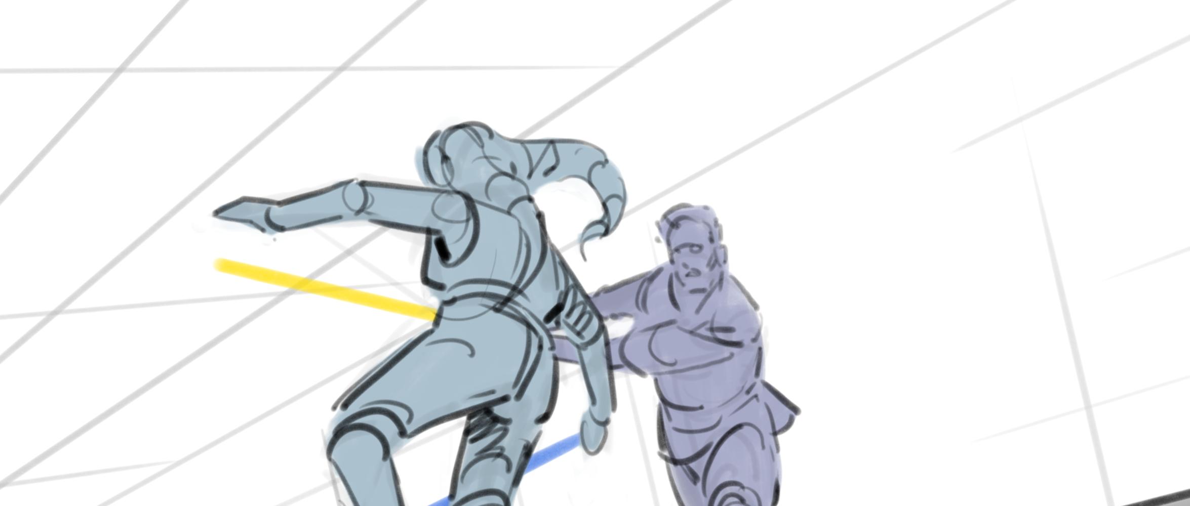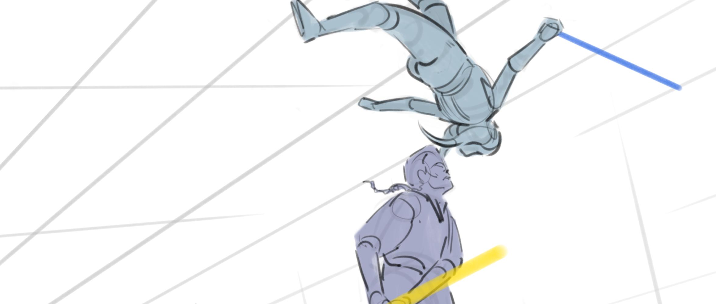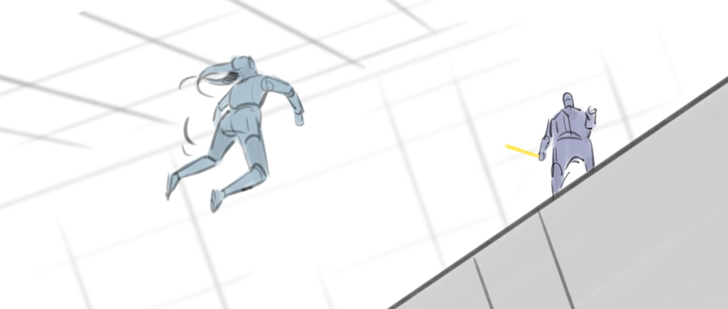 Ici, l’enjeu est avant tout de rendre l’action lisible et dynamique, notamment par un travail spécifique sur la spatialisation et la synthèse de poses clés.
