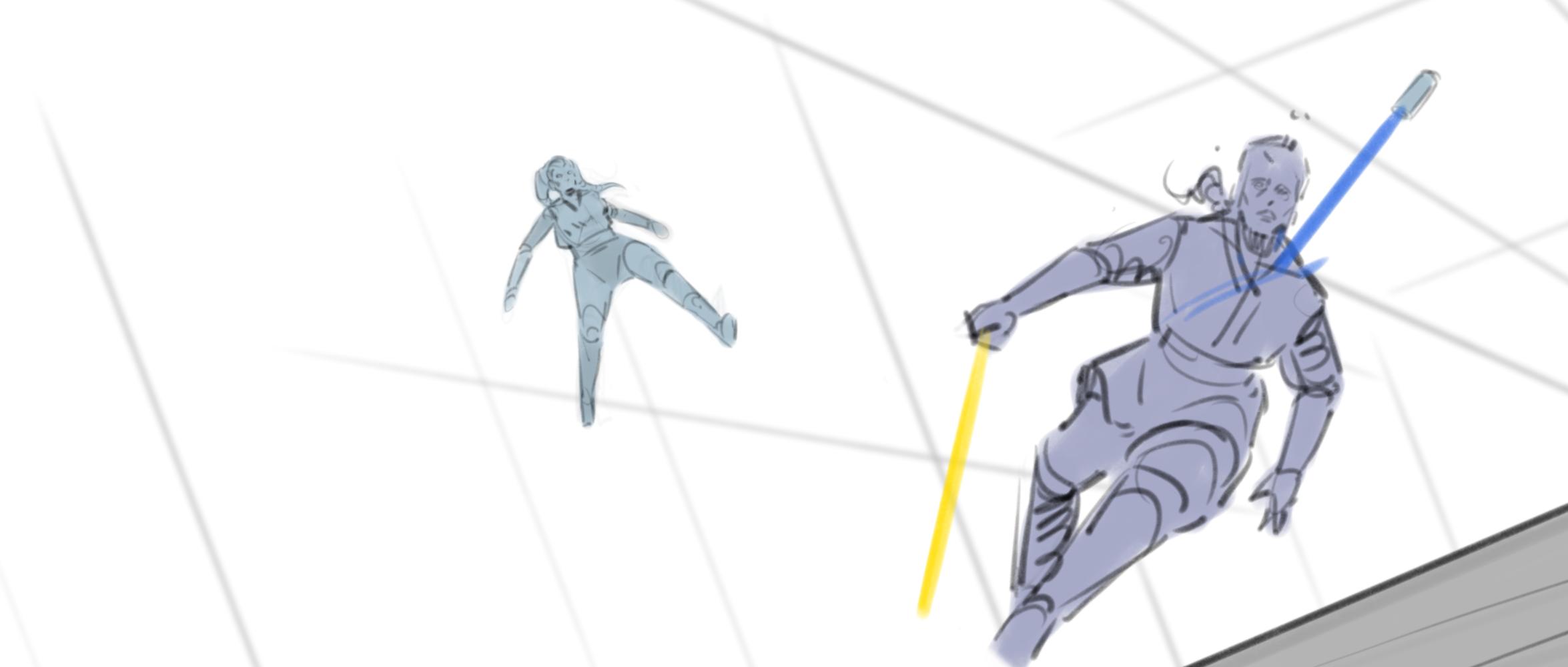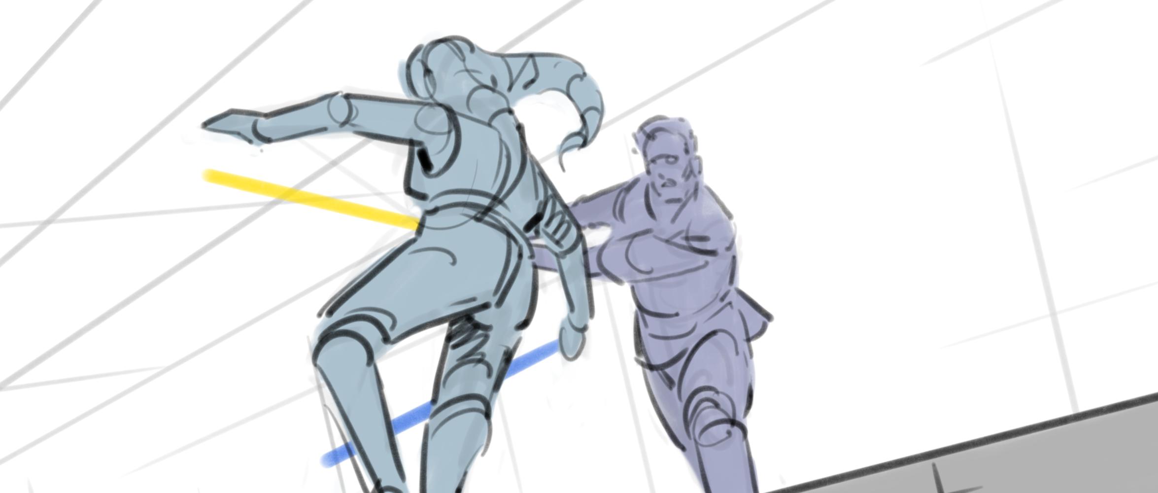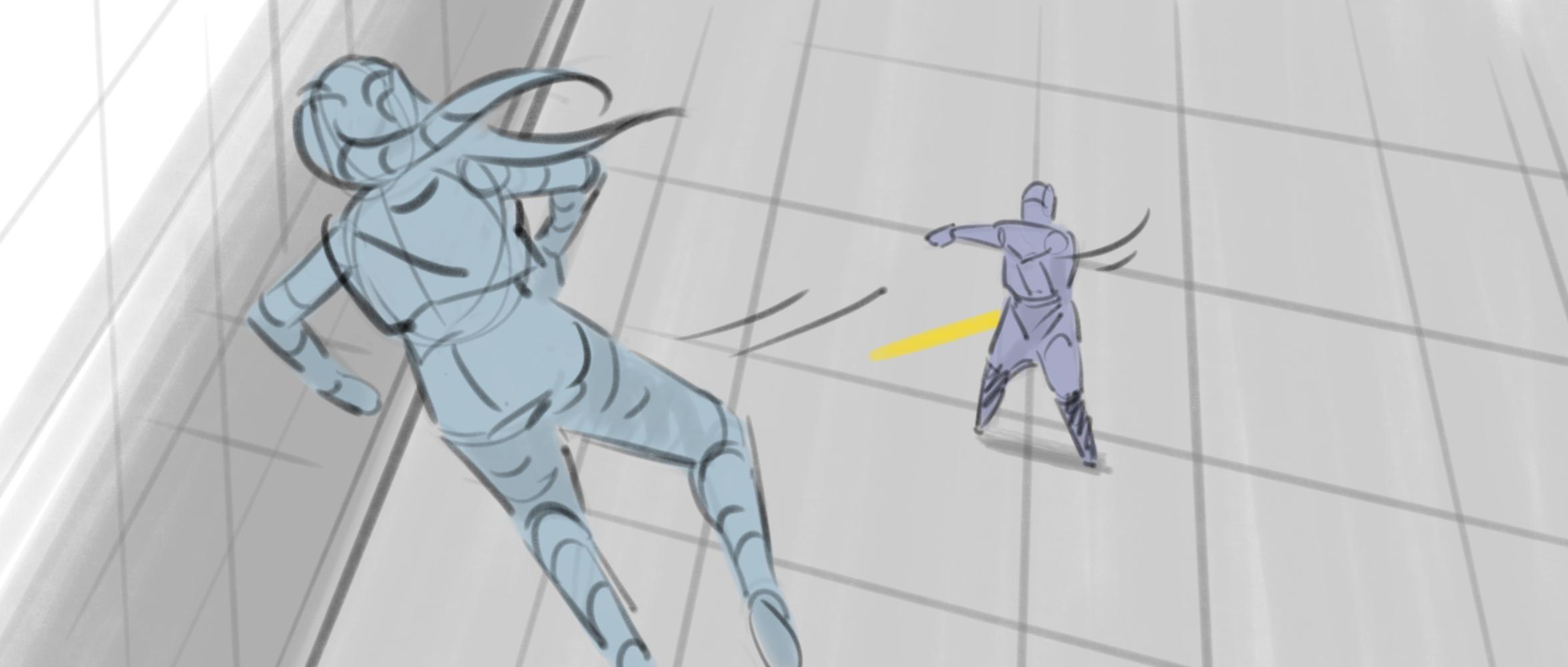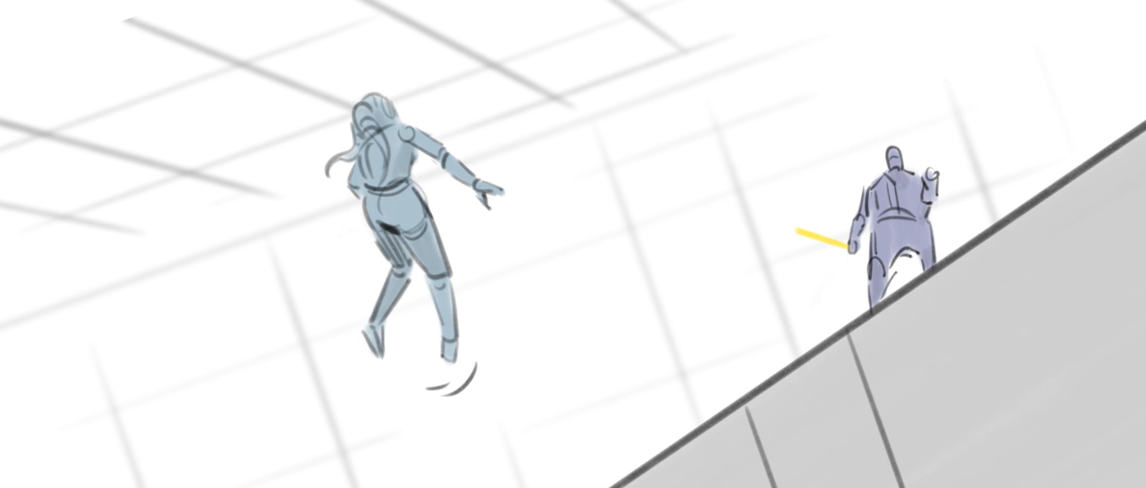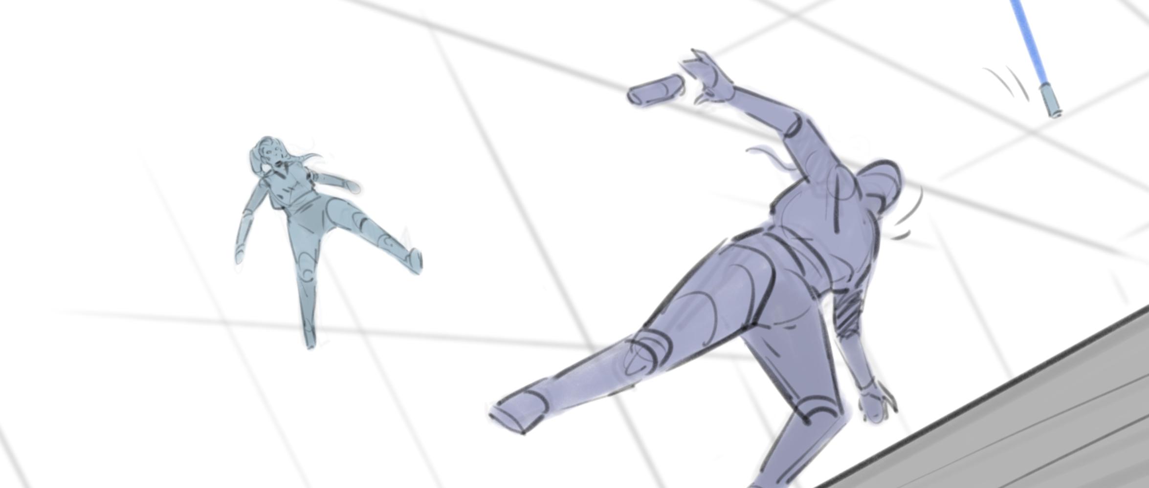 Ici, l’enjeu est avant tout de rendre l’action lisible et dynamique, notamment par un travail spécifique sur la spatialisation et la synthèse de poses clés.