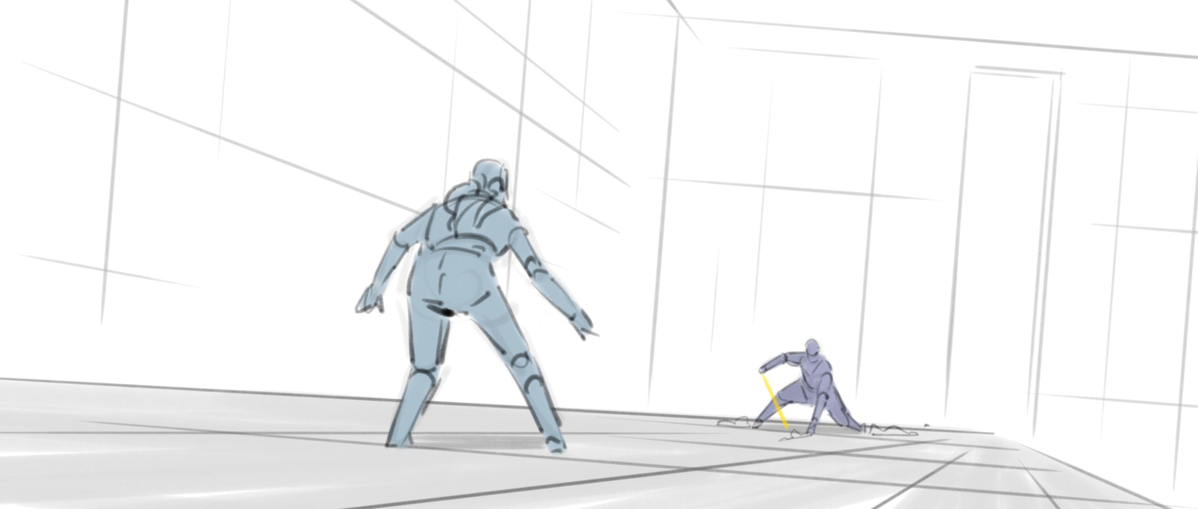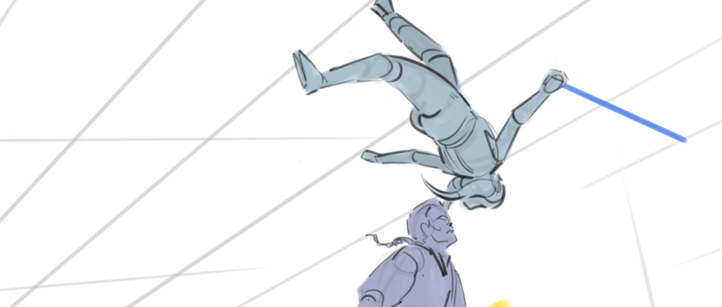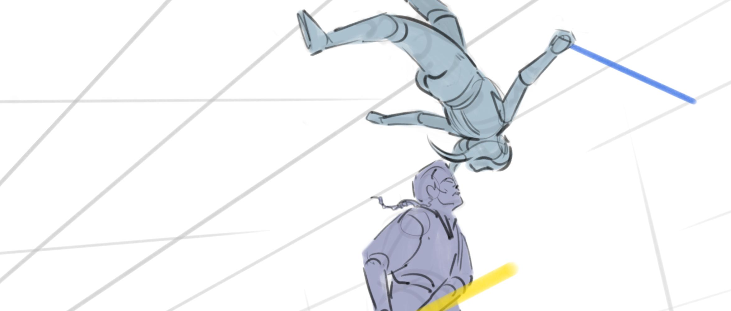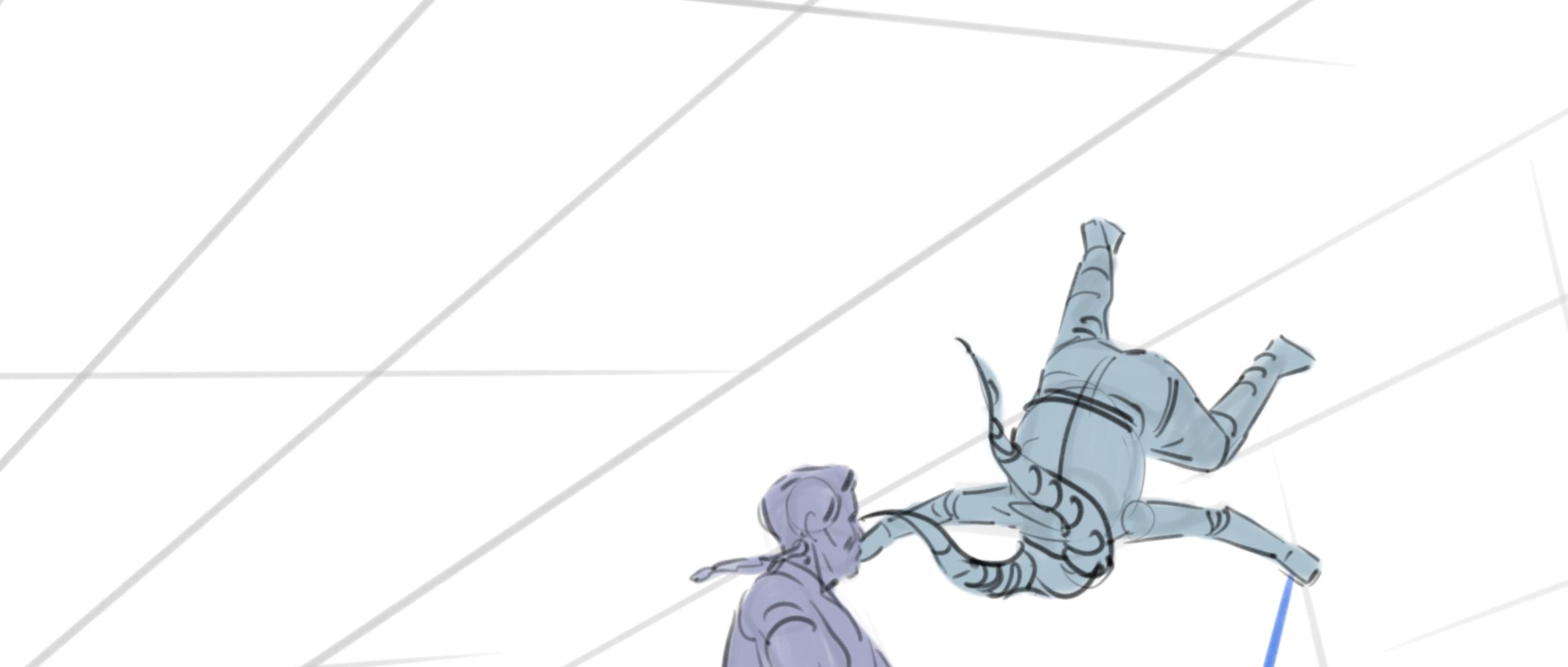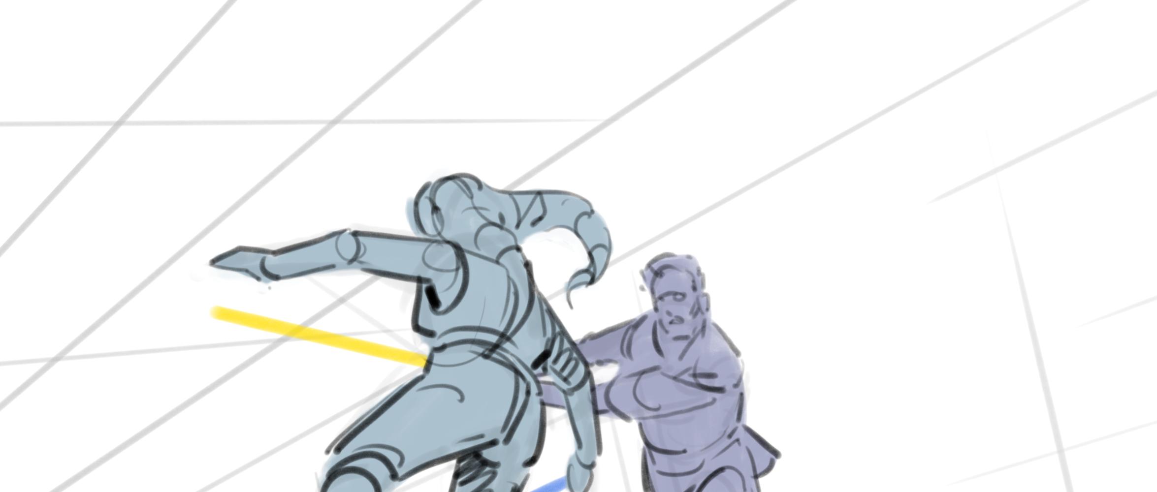 Ici, l’enjeu est avant tout de rendre l’action lisible et dynamique, notamment par un travail spécifique sur la spatialisation et la synthèse de poses clés.