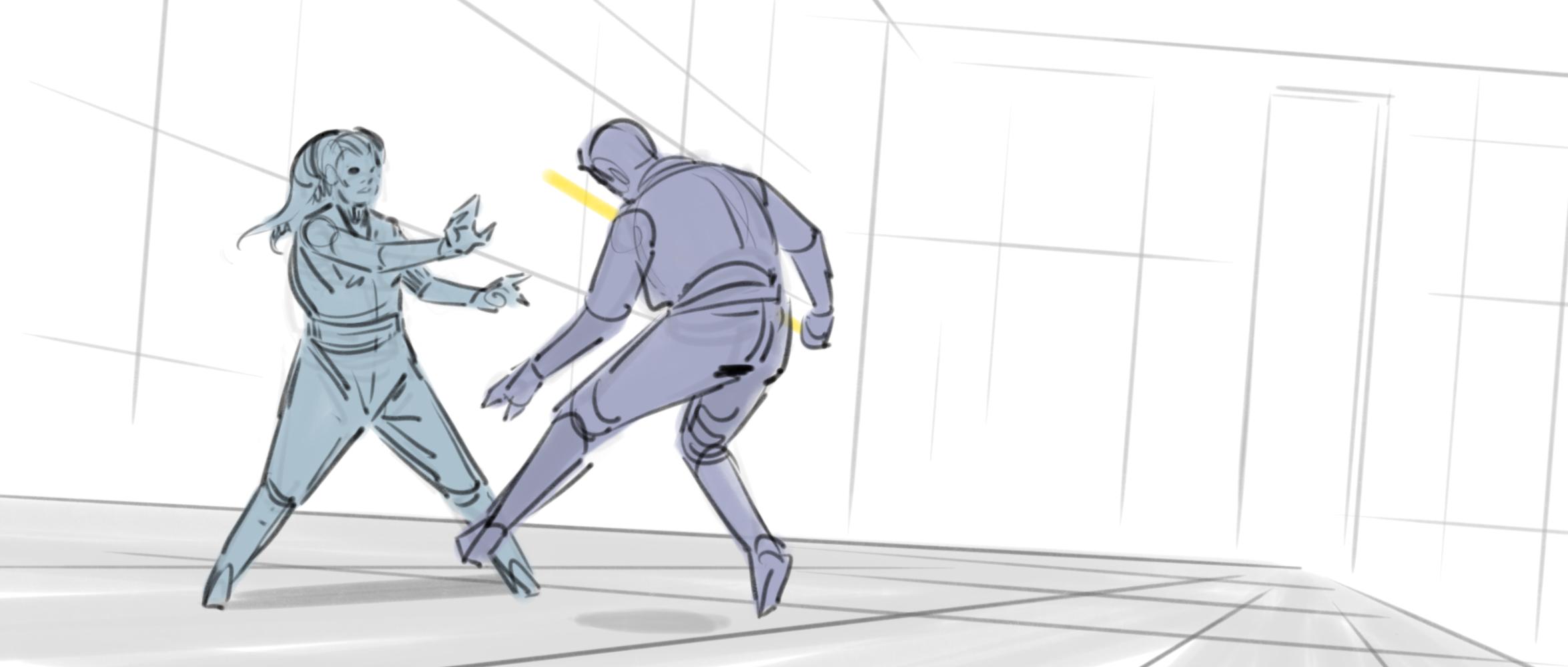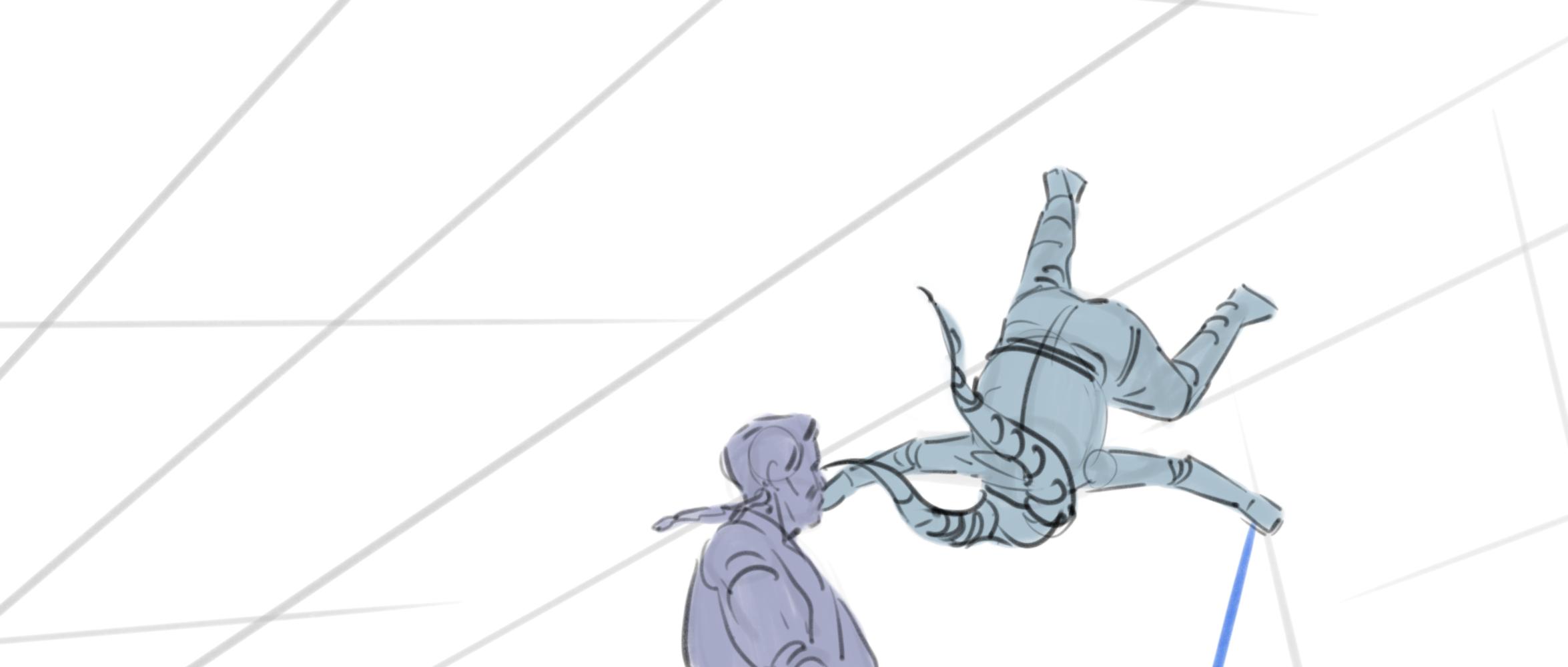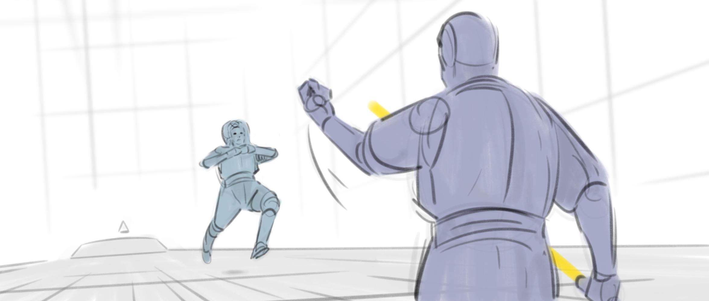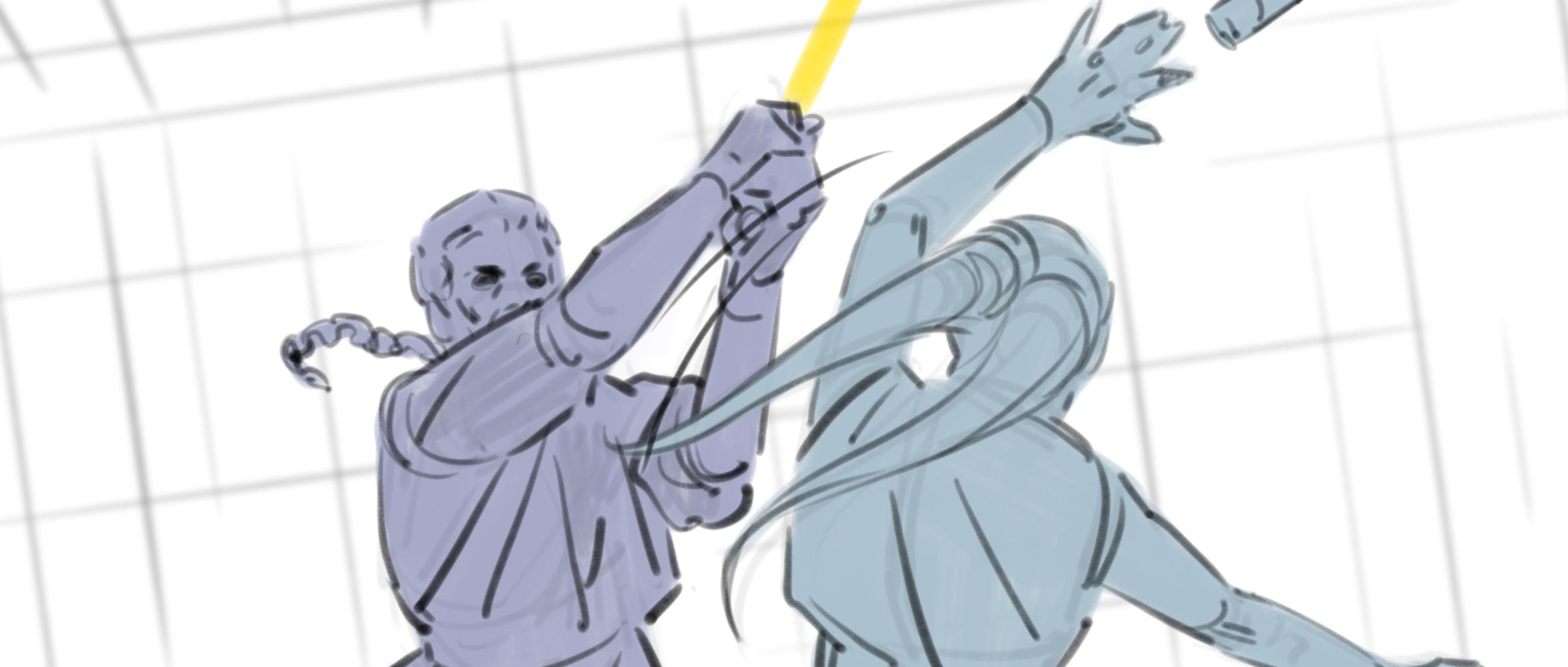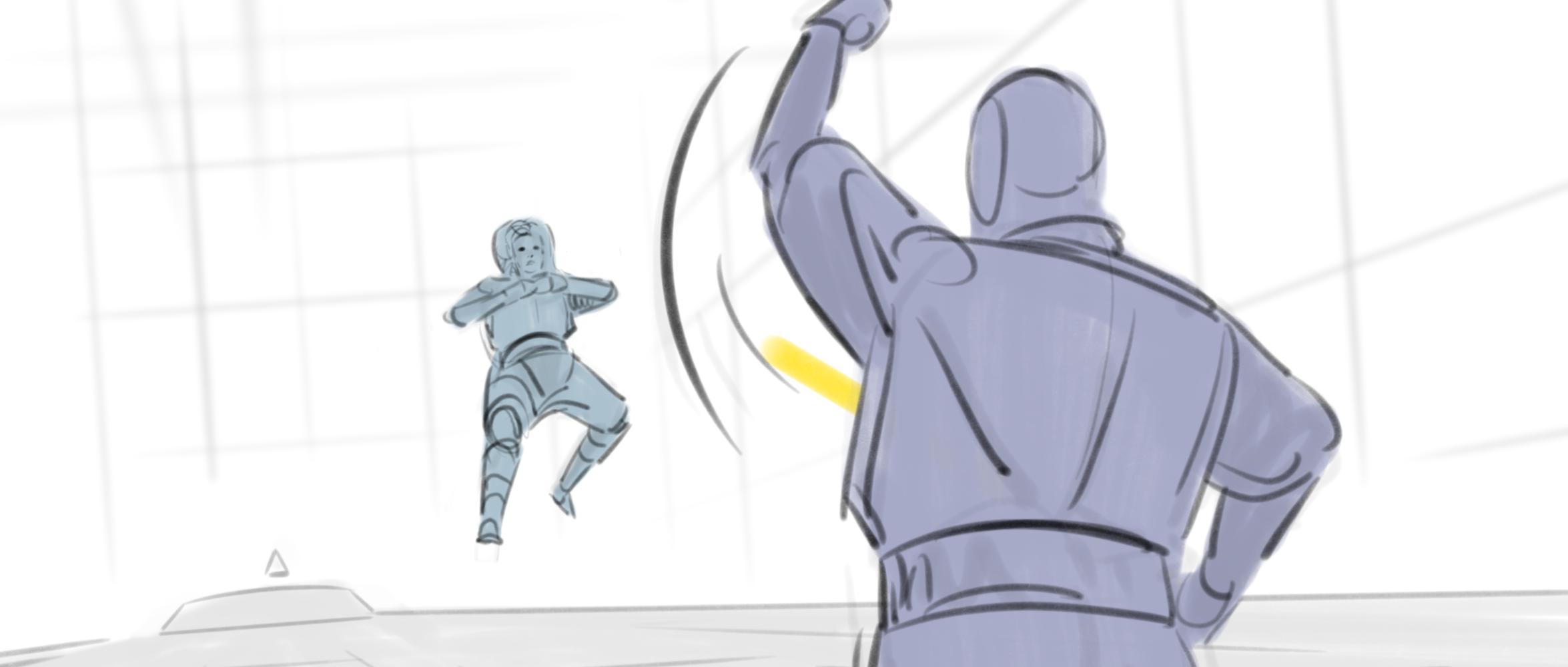 Ici, l’enjeu est avant tout de rendre l’action lisible et dynamique, notamment par un travail spécifique sur la spatialisation et la synthèse de poses clés.