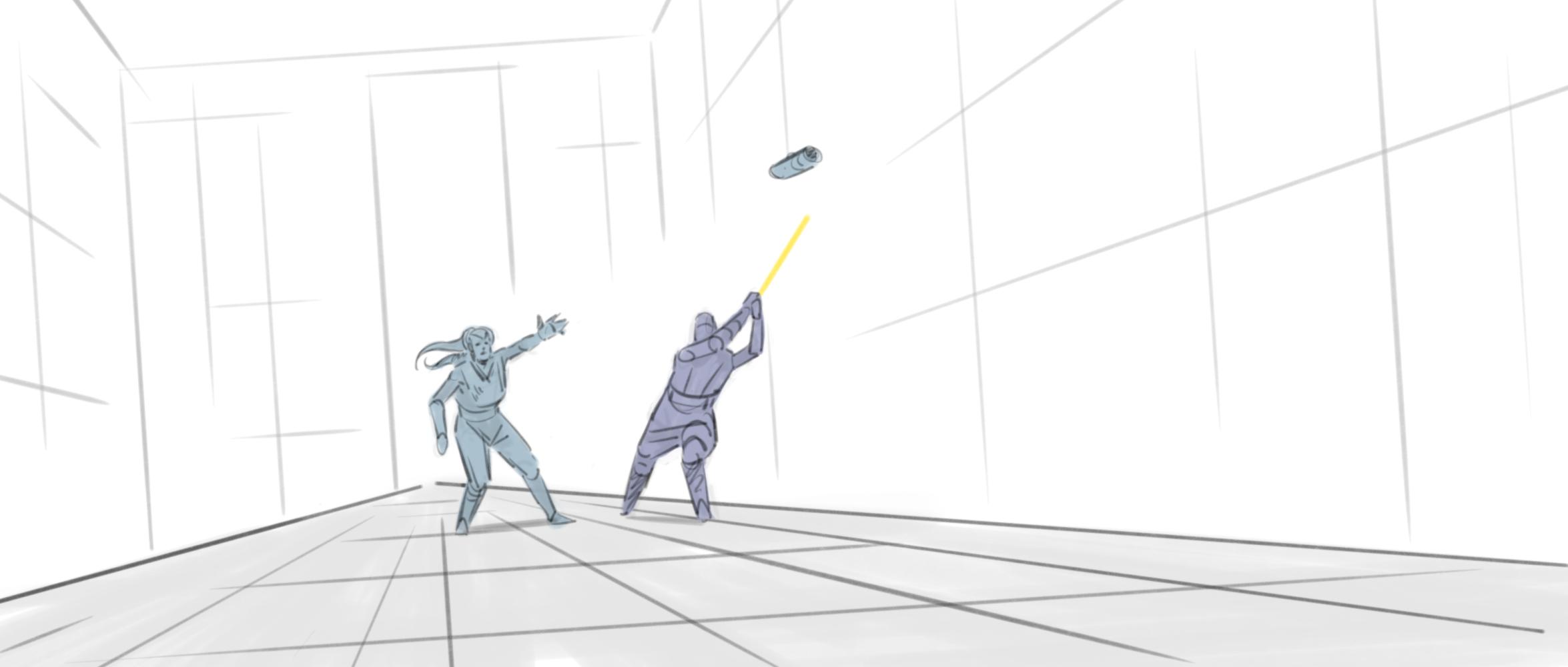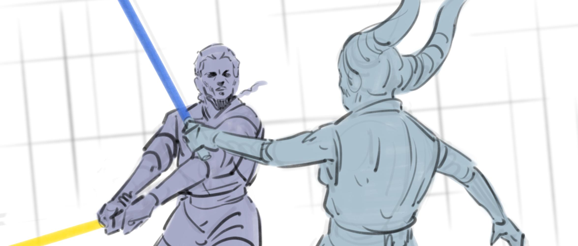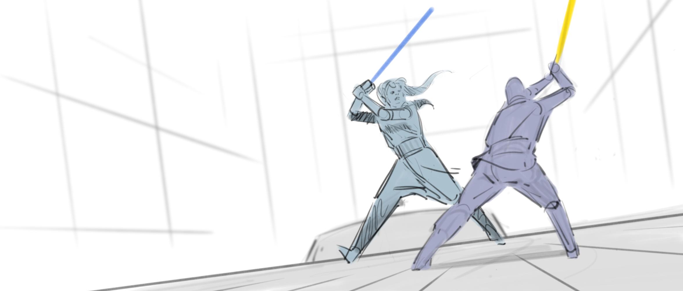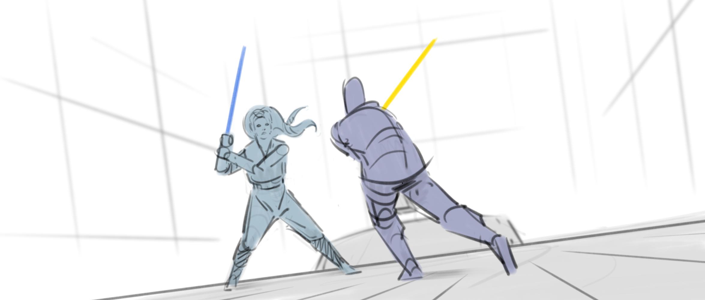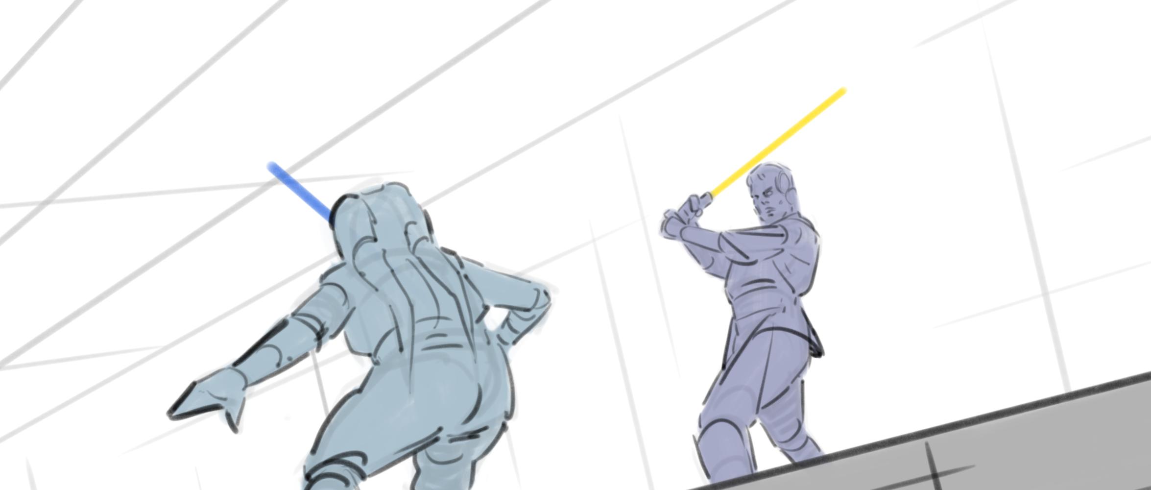 Scène de duel au sabre dans l’univers de Star Wars. En effet, cette franchise offre une grande variété de situations au moment de construire les scènes de duel.