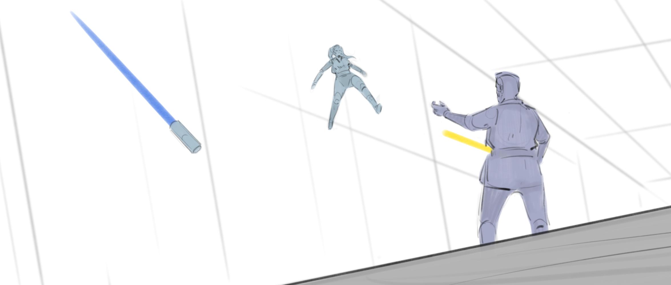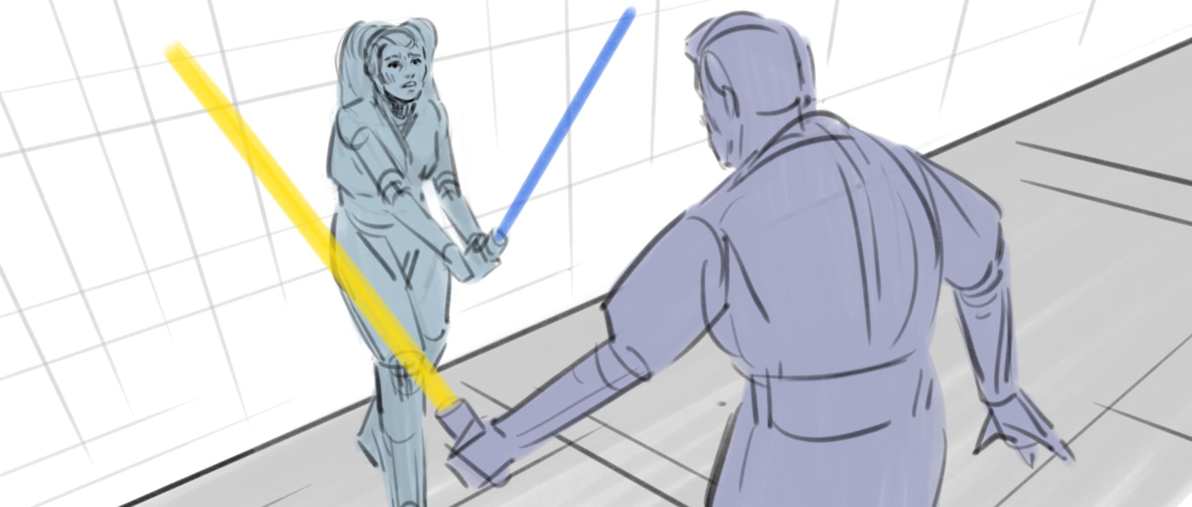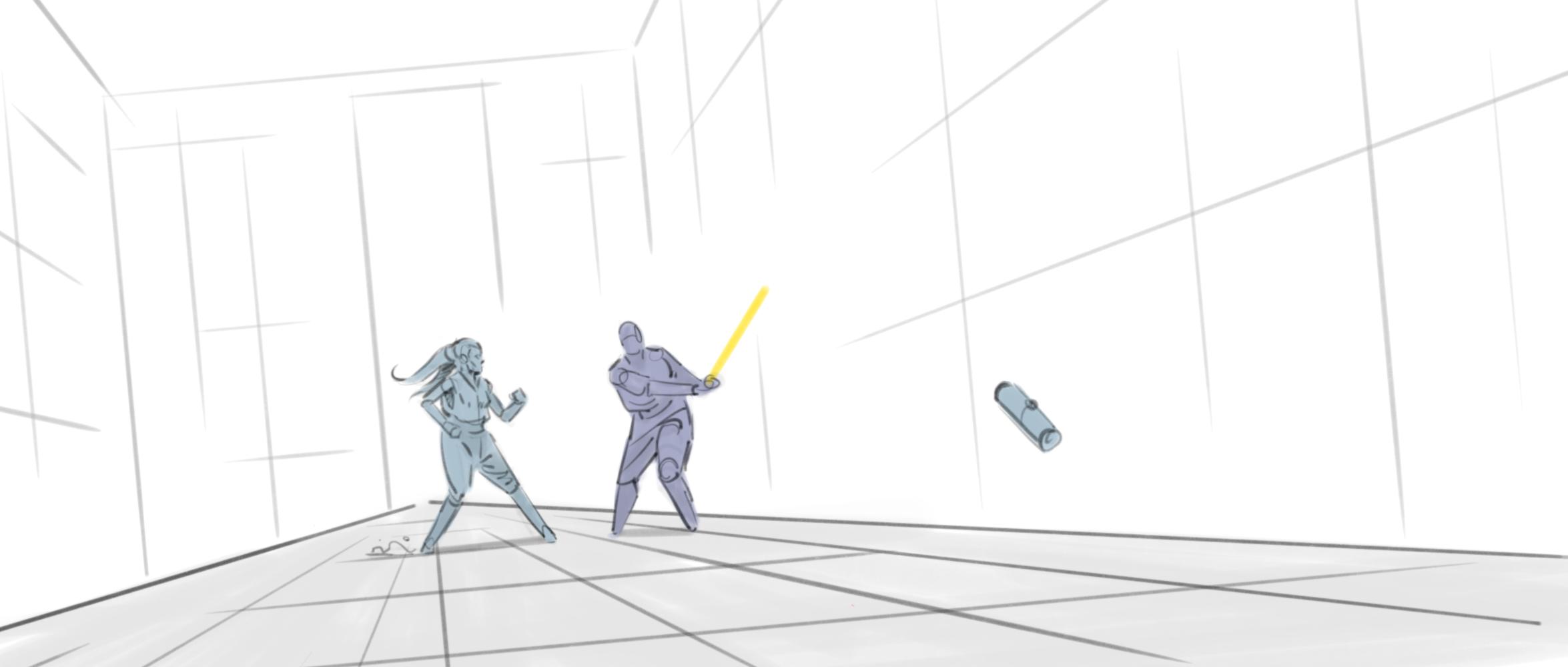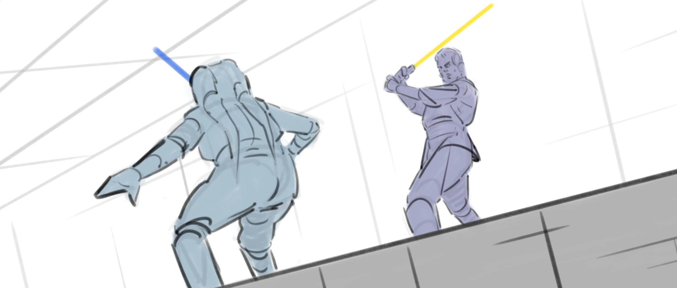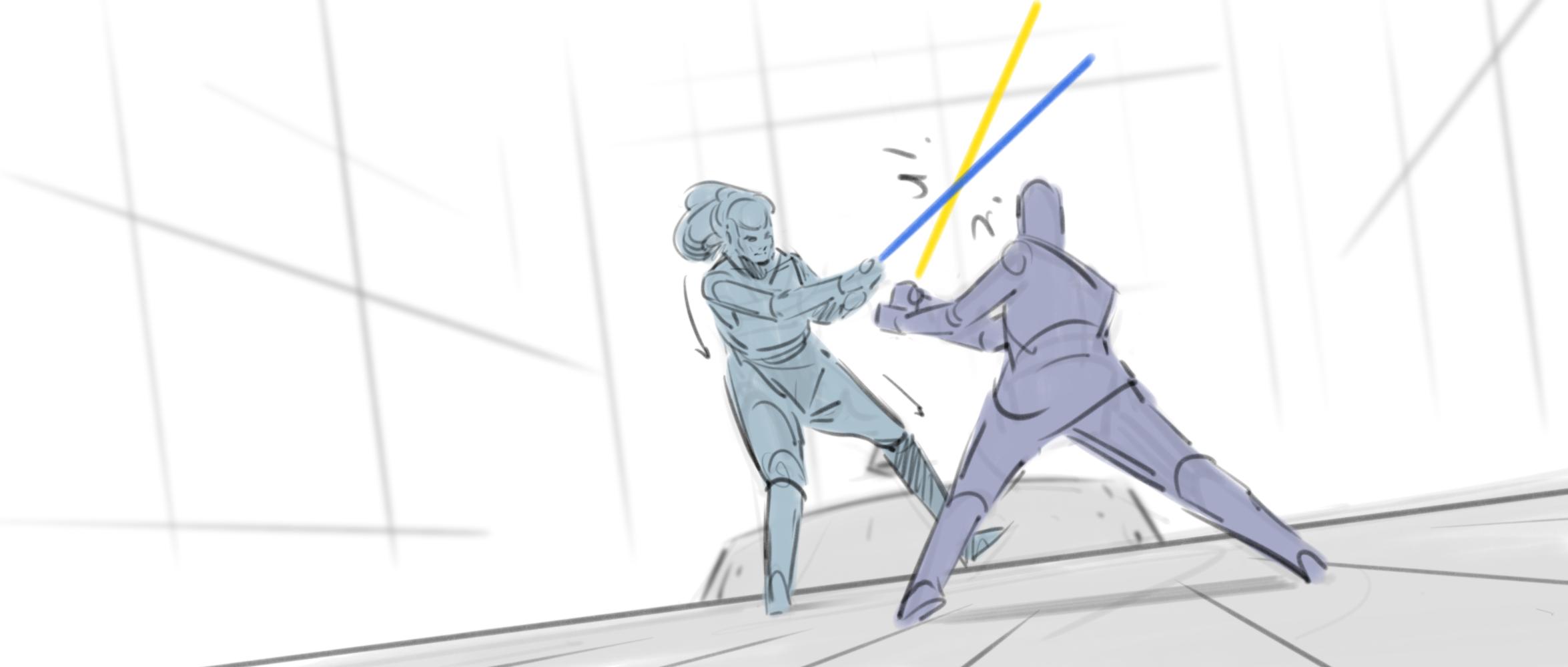 Scène de duel au sabre dans l’univers de Star Wars. En effet, cette franchise offre une grande variété de situations au moment de construire les scènes de duel.