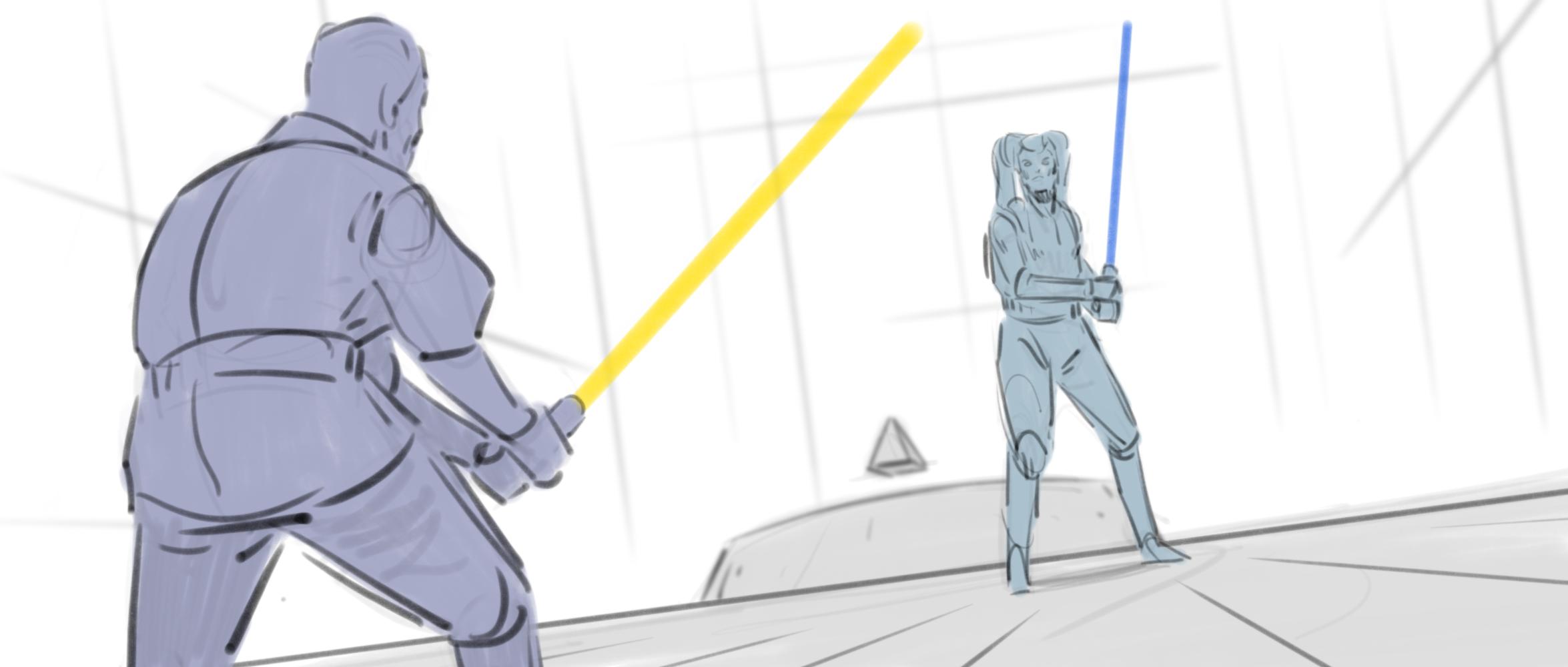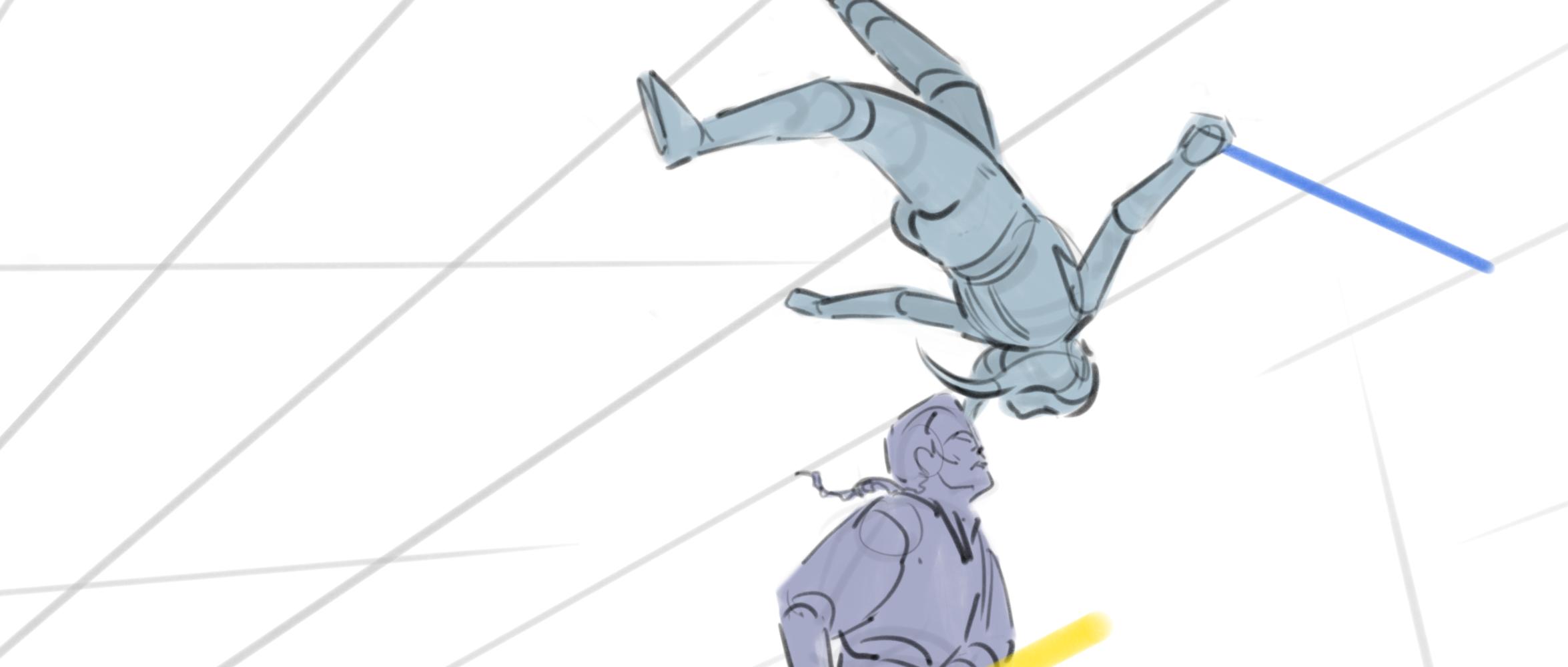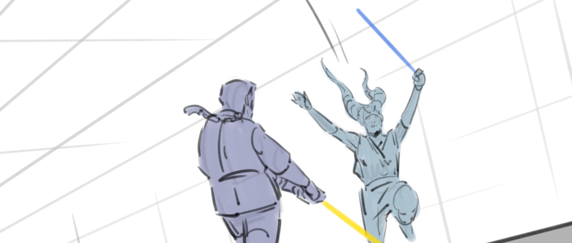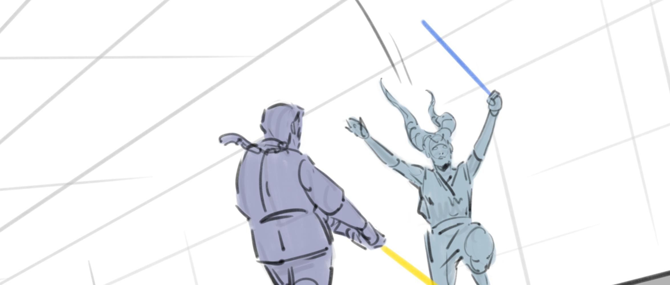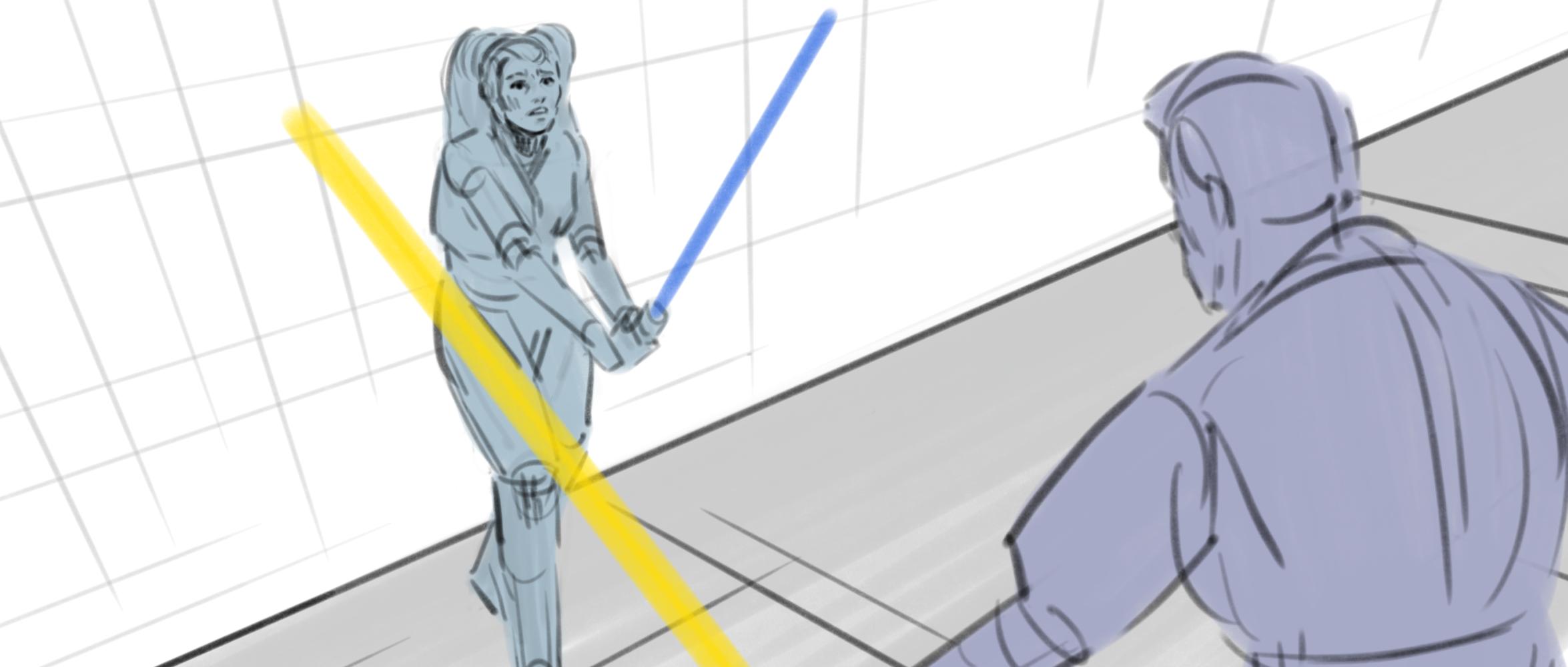 Scène de duel au sabre dans l’univers de Star Wars. En effet, cette franchise offre une grande variété de situations au moment de construire les scènes de duel.