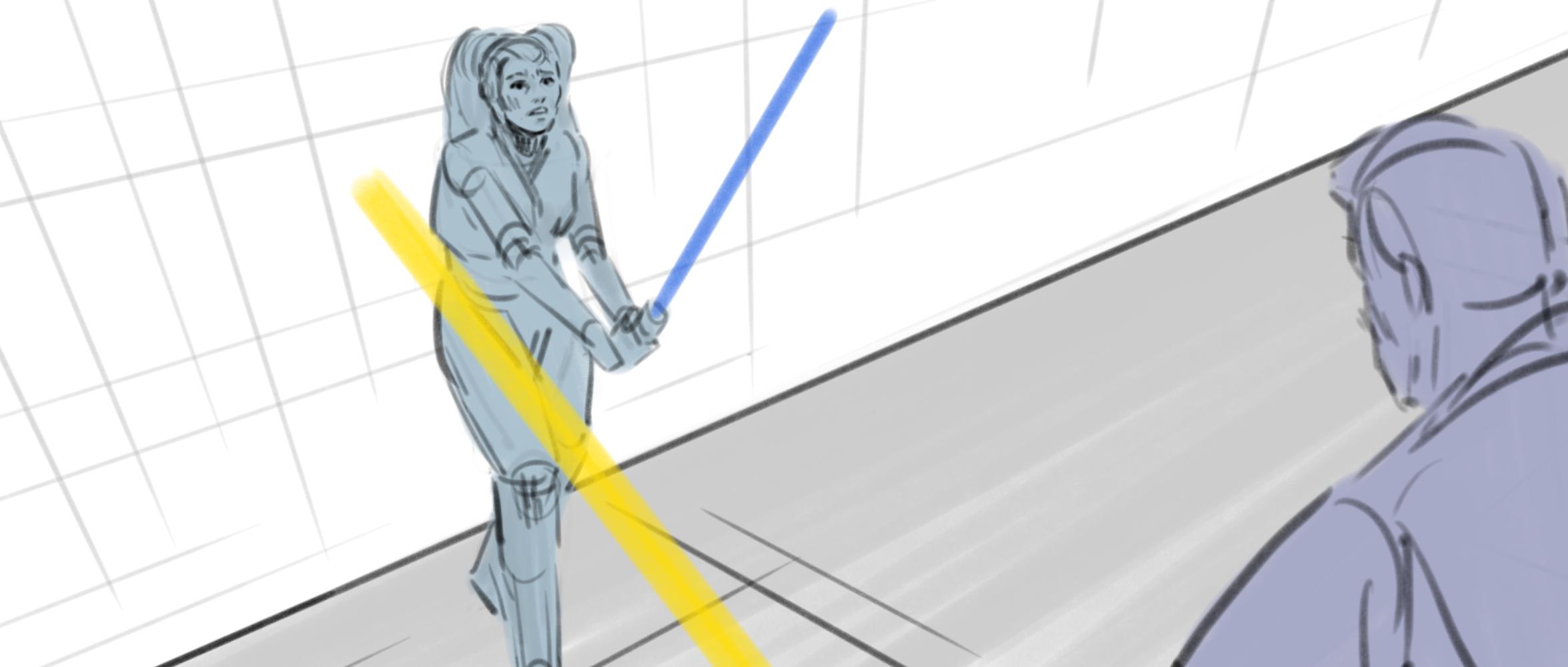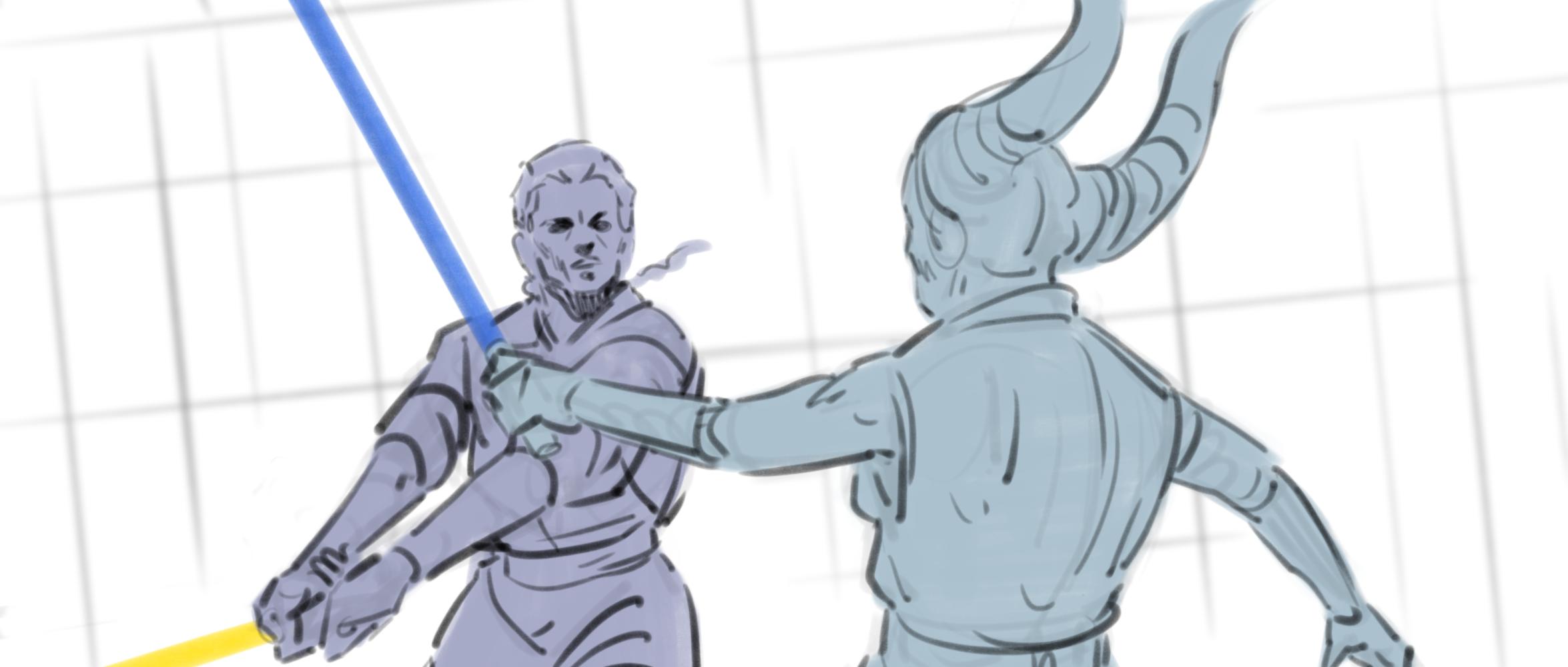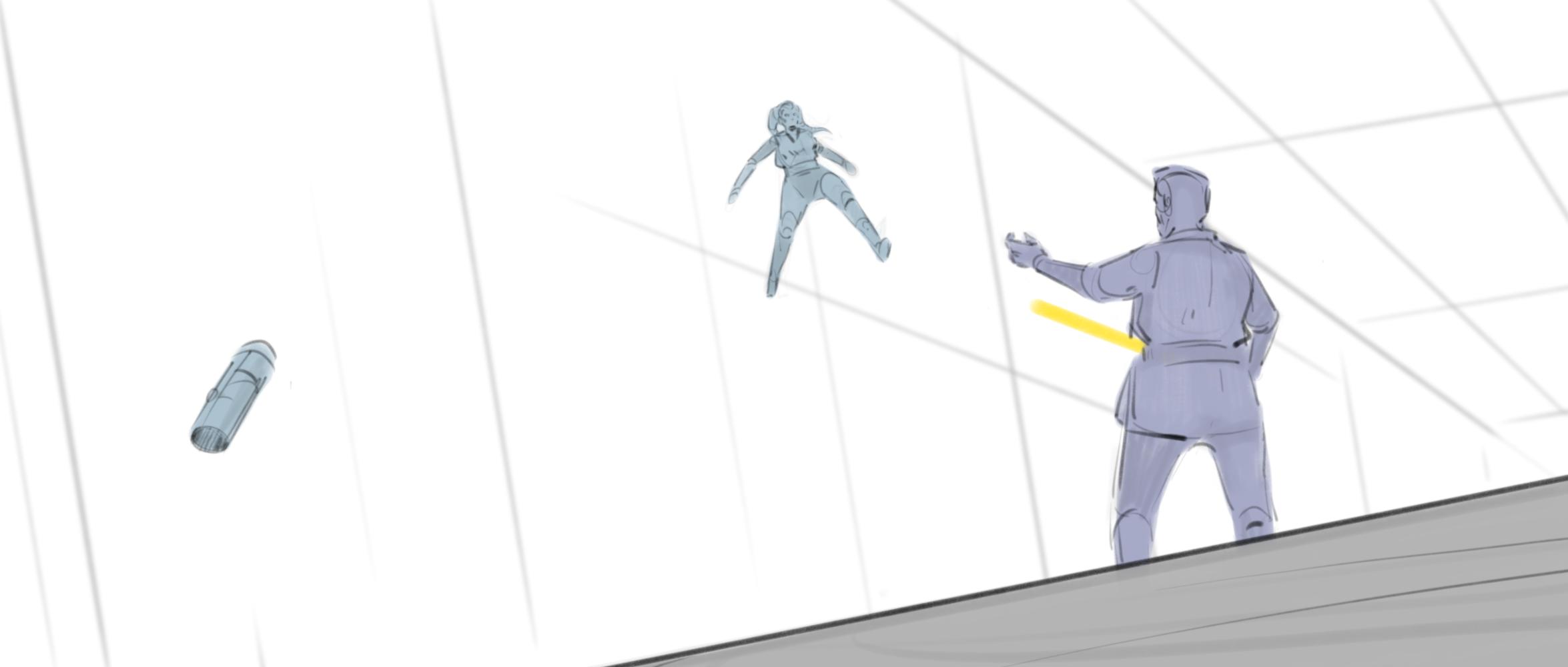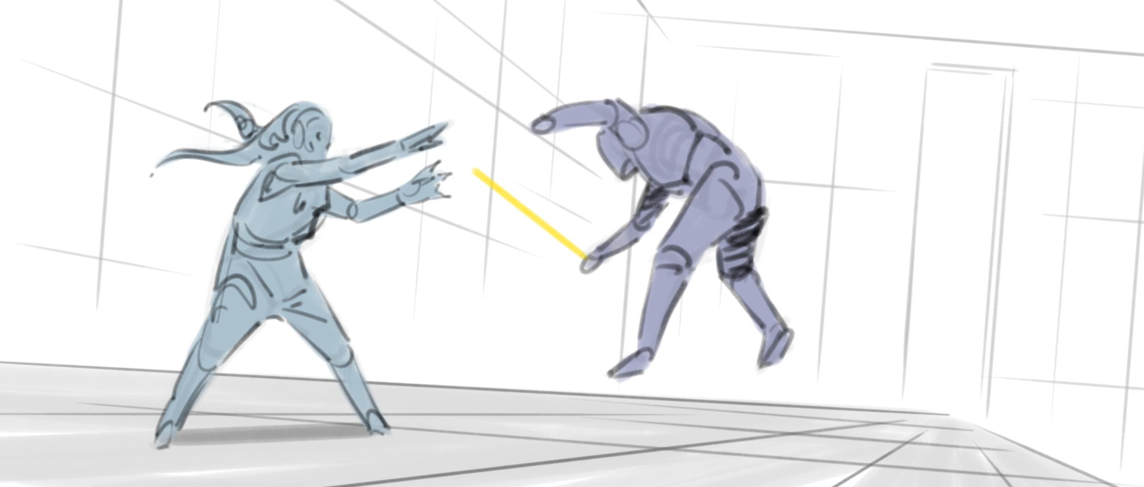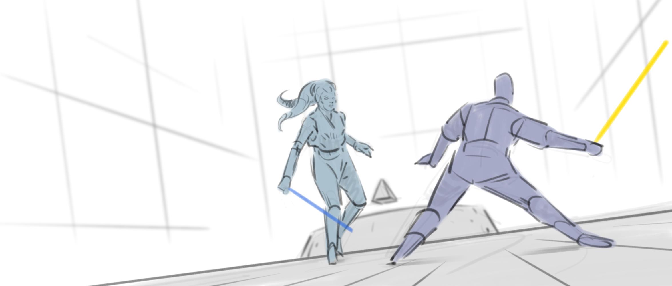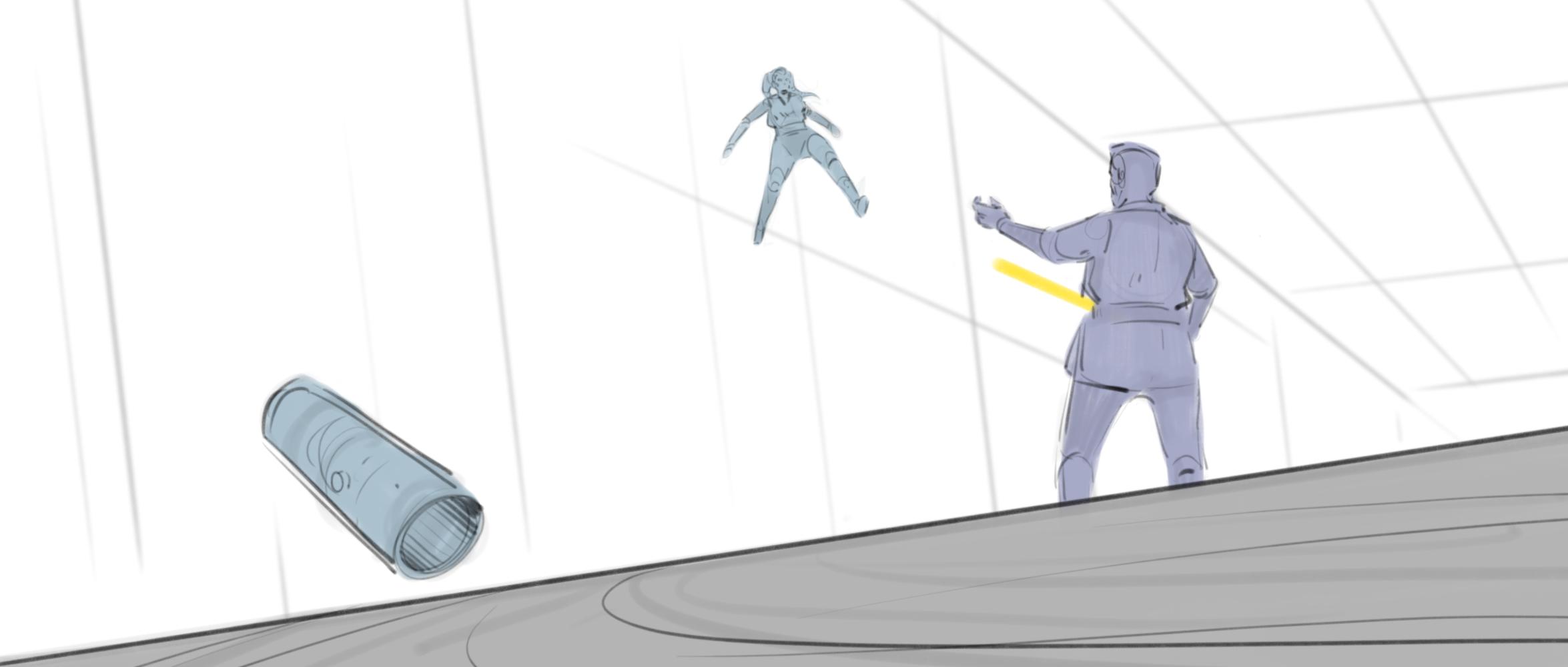 Scène de duel au sabre dans l’univers de Star Wars. En effet, cette franchise offre une grande variété de situations au moment de construire les scènes de duel.
