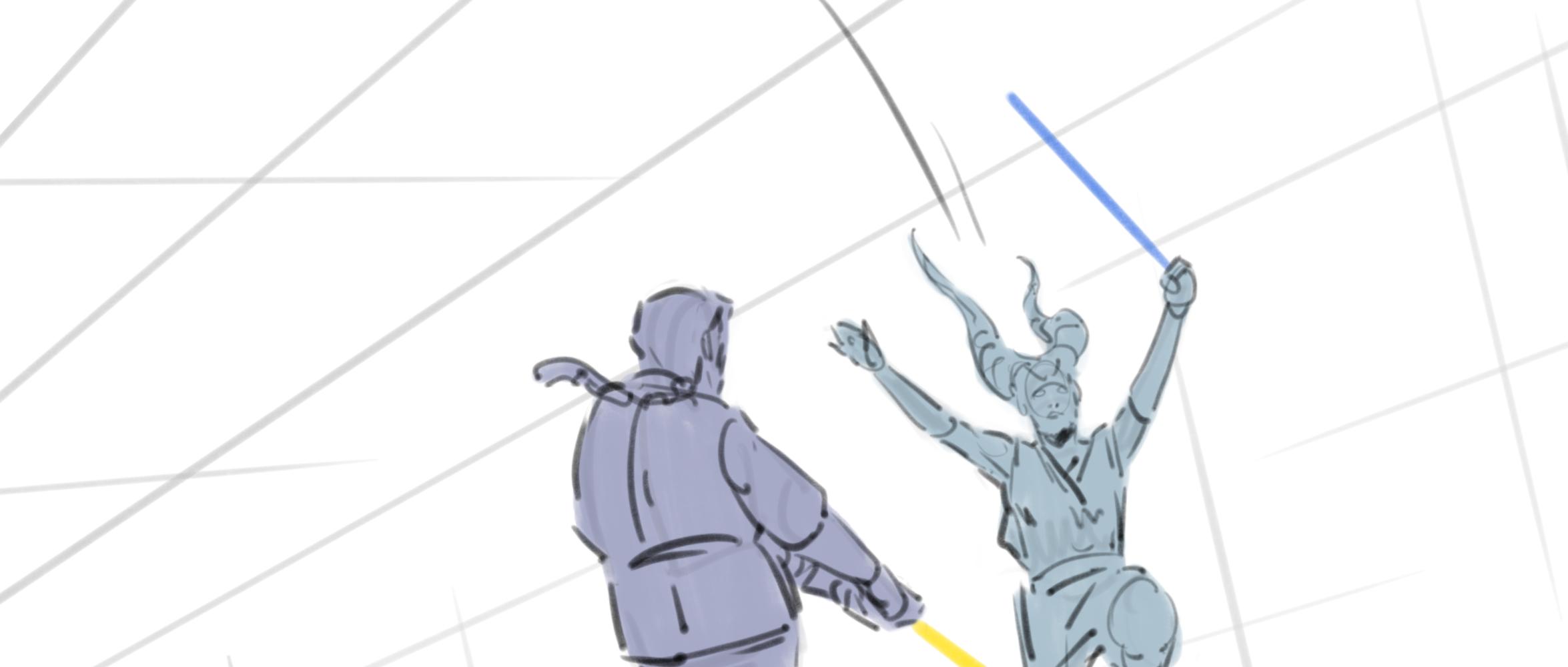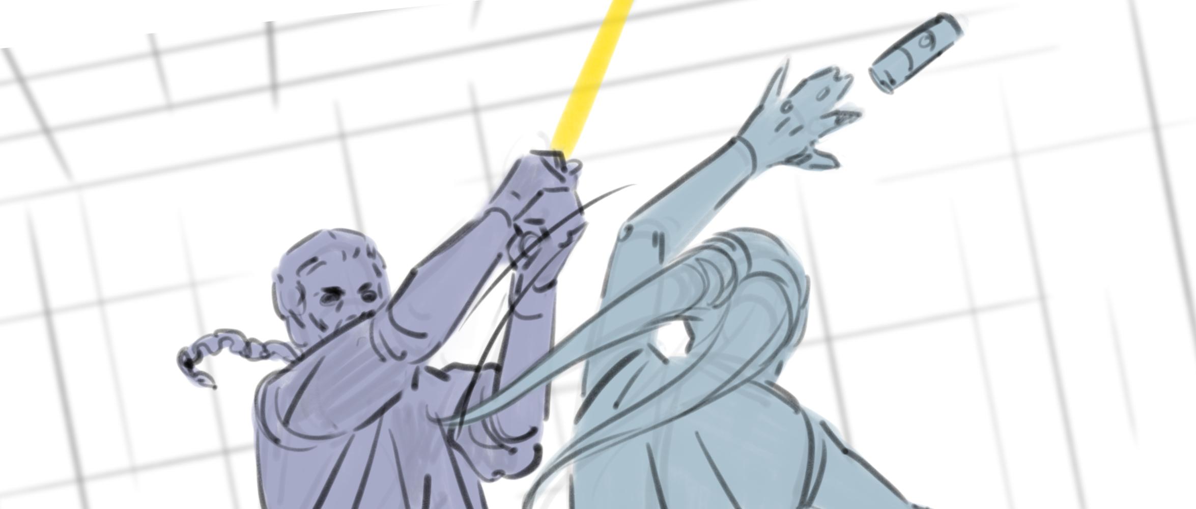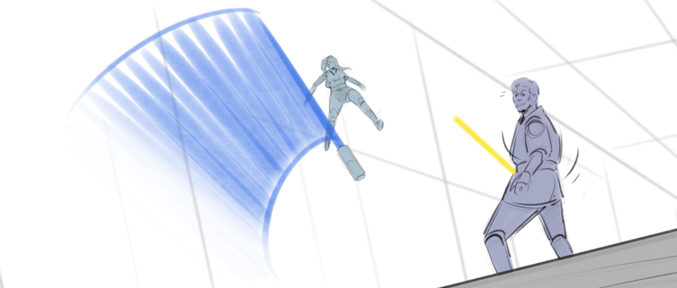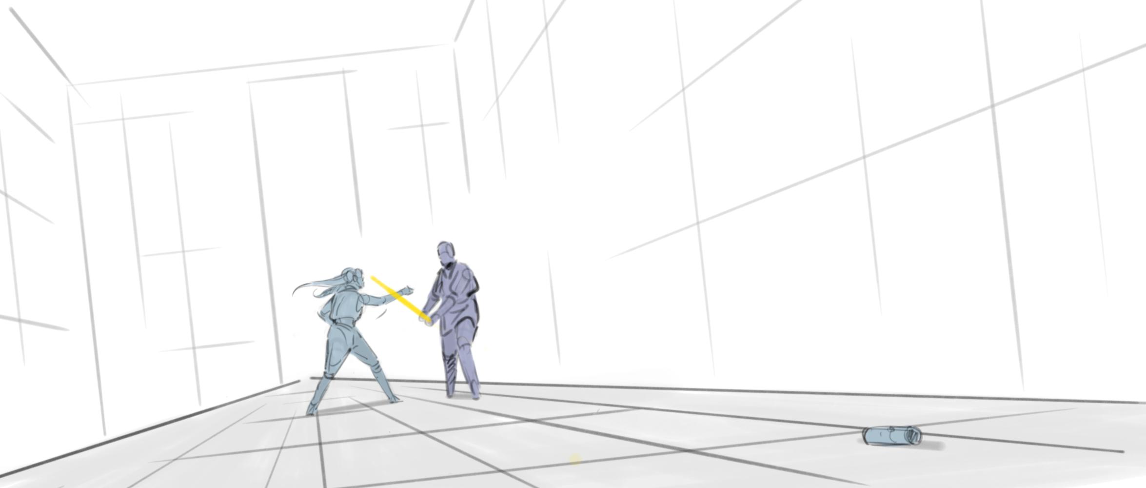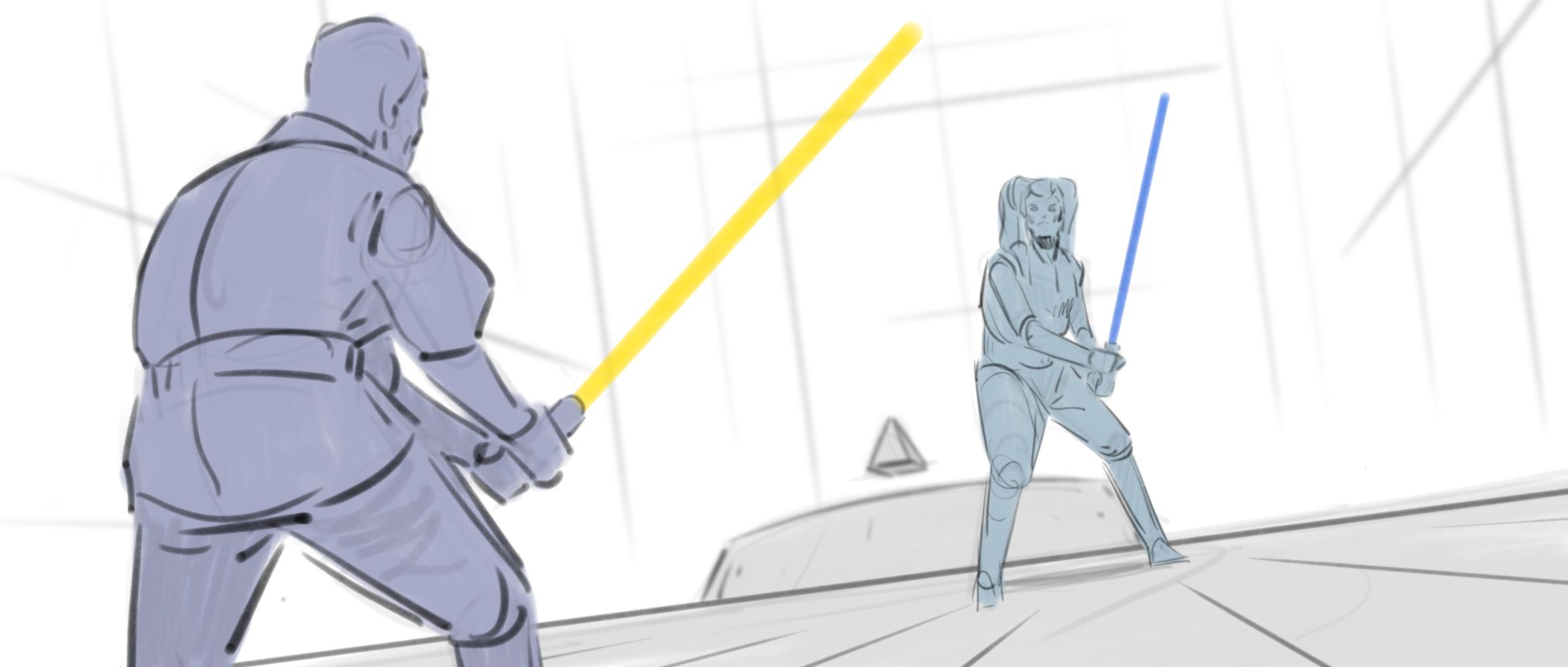 Scène de duel au sabre dans l’univers de Star Wars. En effet, cette franchise offre une grande variété de situations au moment de construire les scènes de duel.