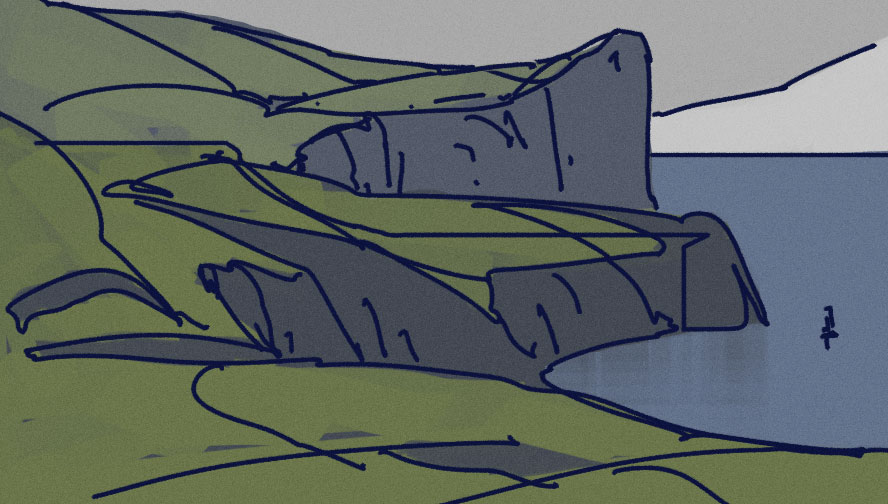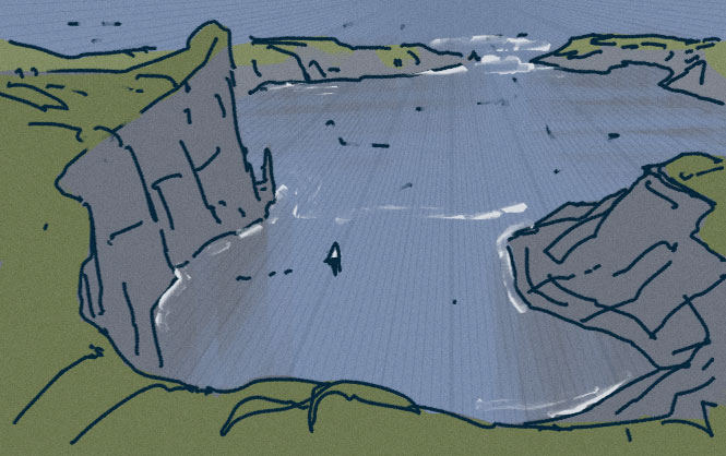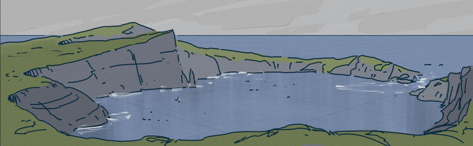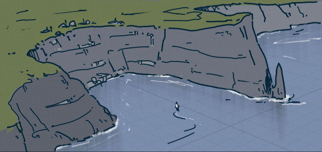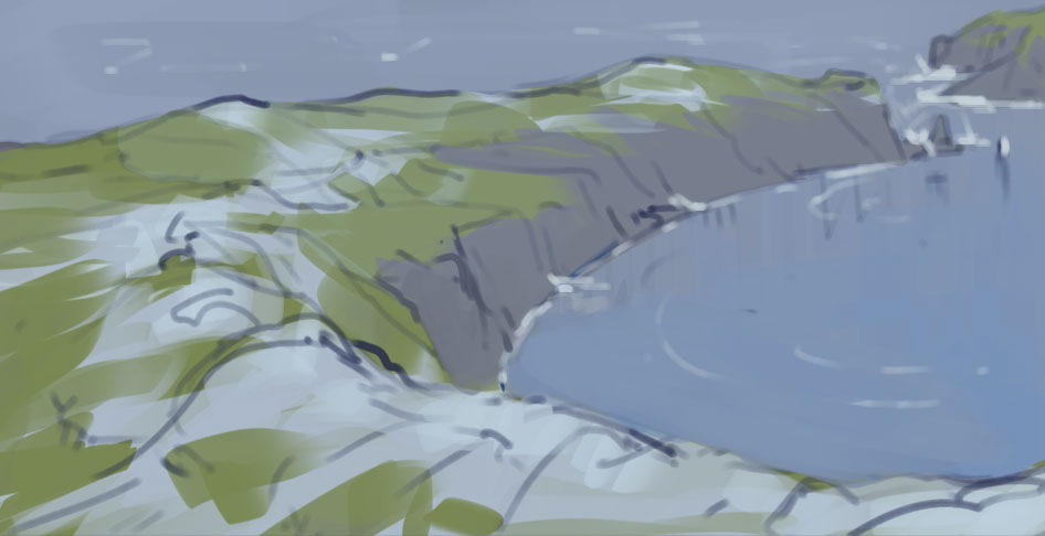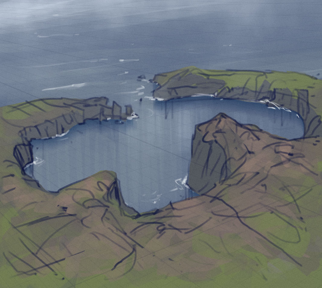 Ces recherches s’attardent avant tout sur la géographie de l’île inspirée par Santorin et sa caldeira caractéristique.